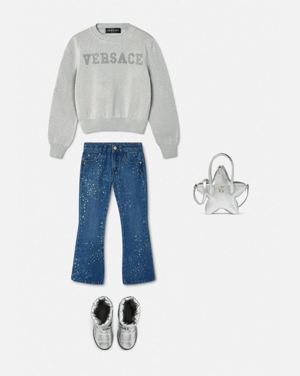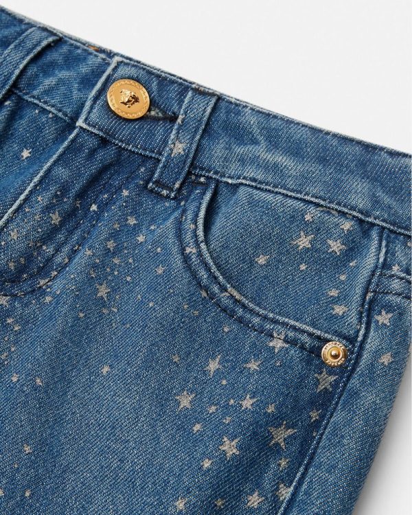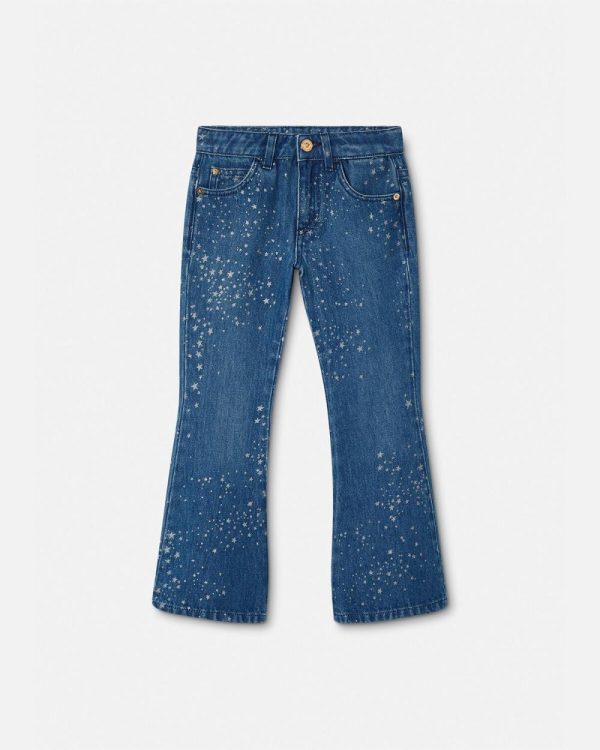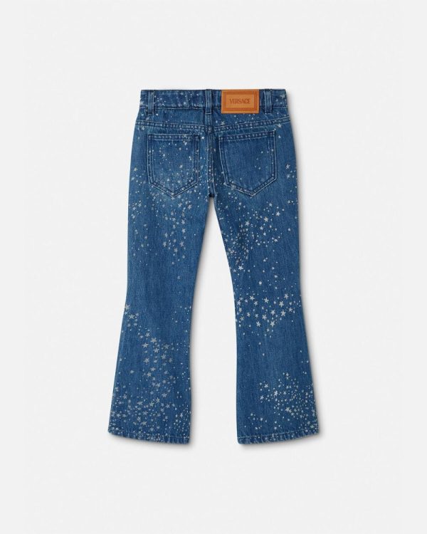 These flared jeans are made from cotton denim and features glittered star motifs throughout. A small Medusa stud accents the five-pocket design.