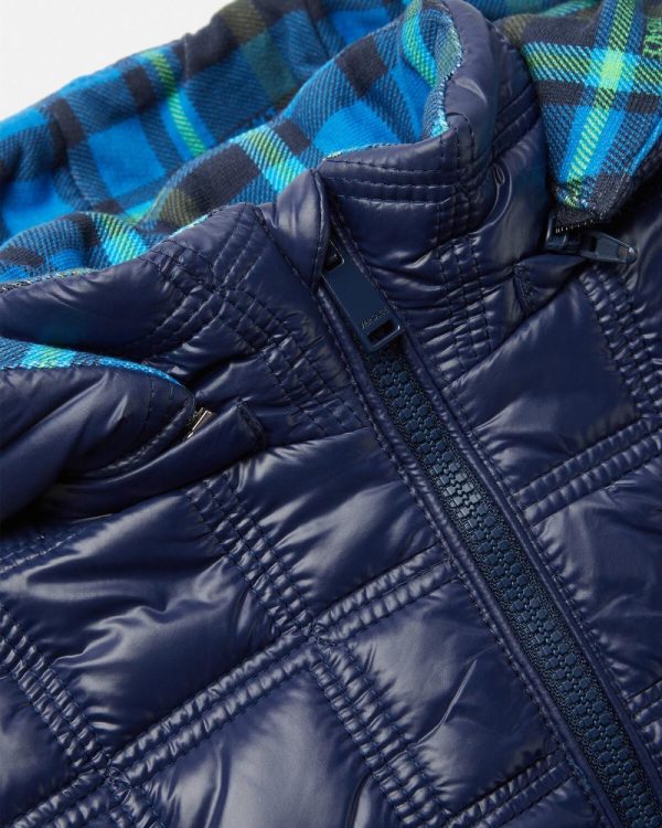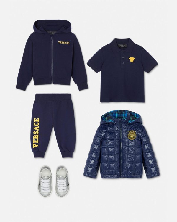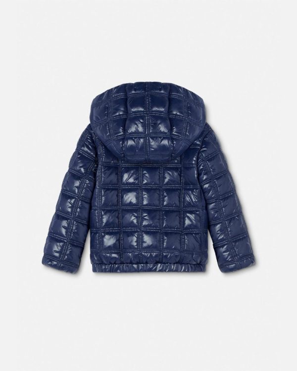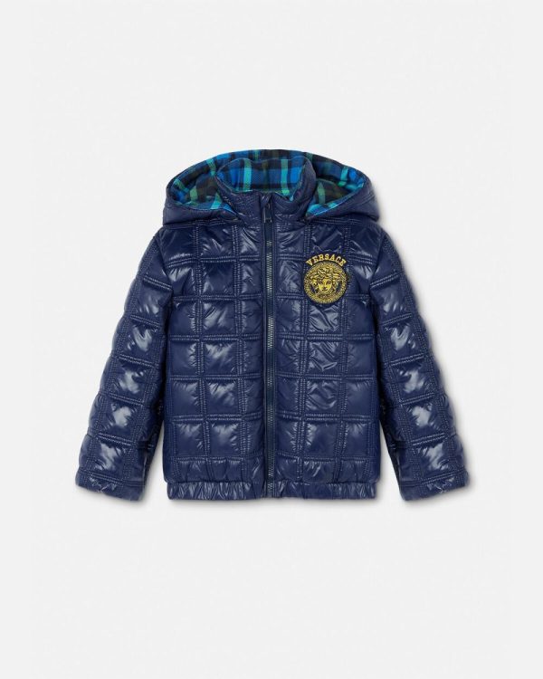 A down padded jacket to keep little ones warm featuring a quilted check pattern and contrasting Tartan Kids print on the detachable hood. The outerwear style embroidered Varsity-inspired Versace Logo and Medusa Kids patch on the chest.