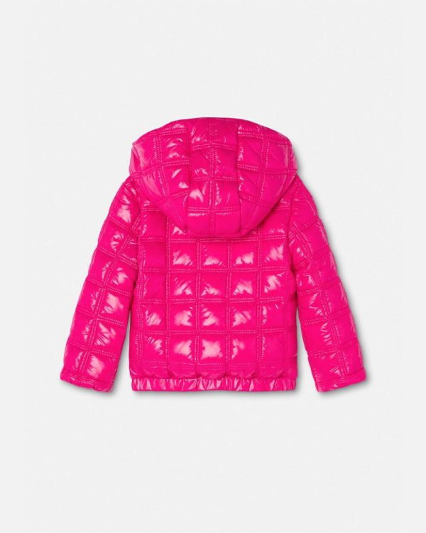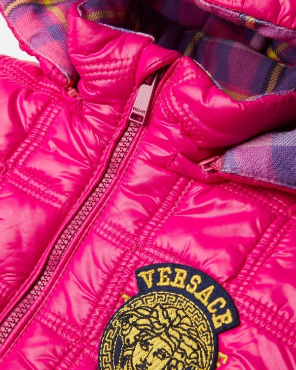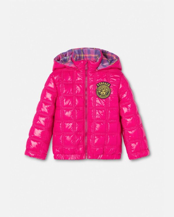 A down padded jacket to keep little ones warm featuring a quilted check pattern and contrasting Tartan Kids print on the detachable hood. The outerwear style embroidered Varsity-inspired Versace Logo and Medusa Kids patch on the chest.
