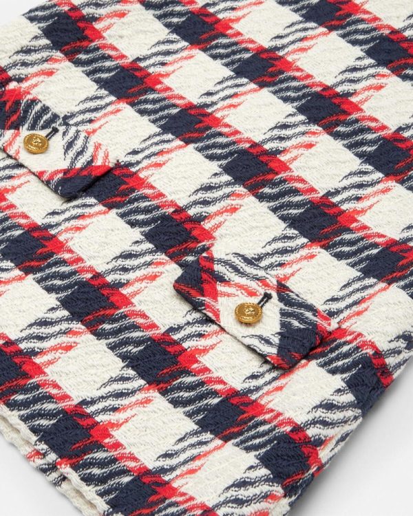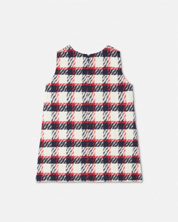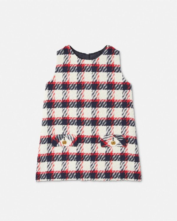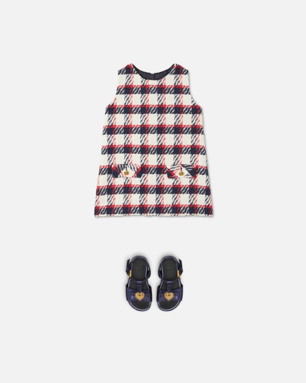 A shift mini dress in checked tweed featuring a sleeveless design and accent Medusa buttons at the front.