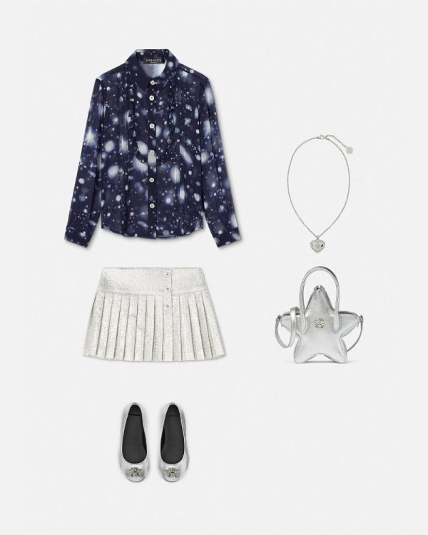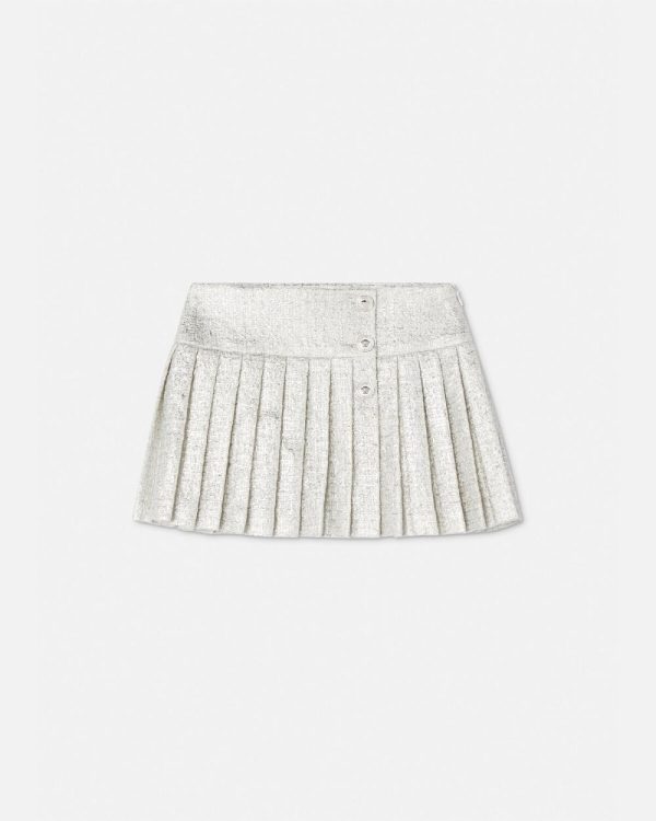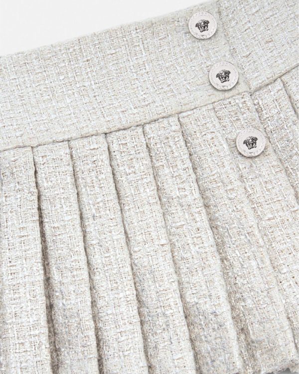 A tweed mini skirt in a metallic finish and accented by decorative Medusa hardware.