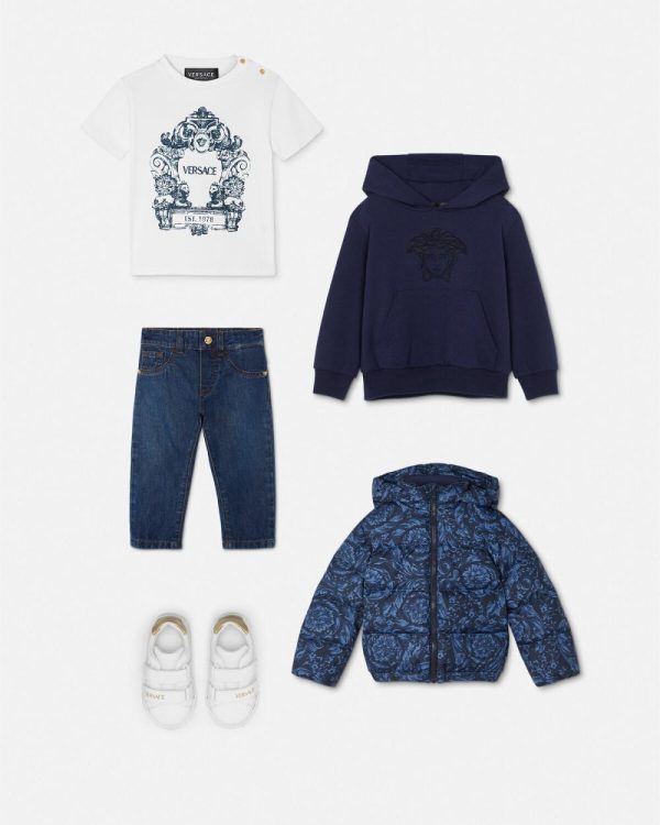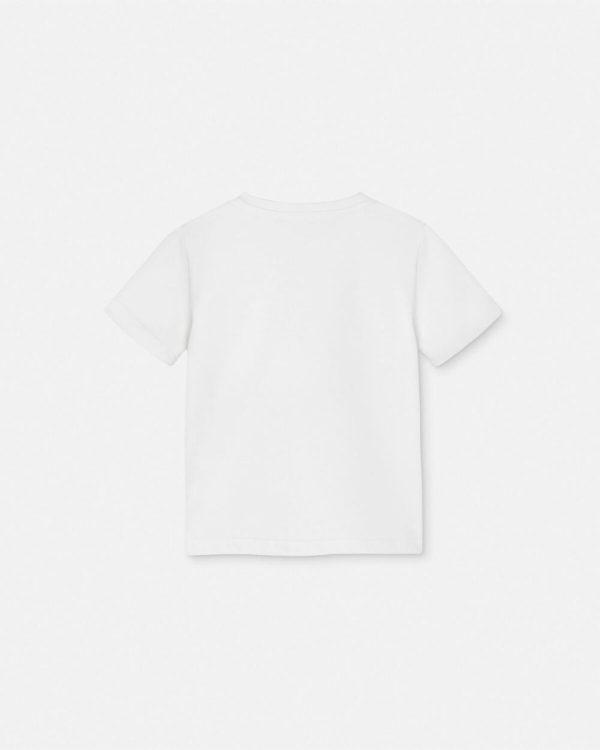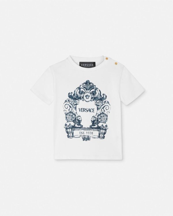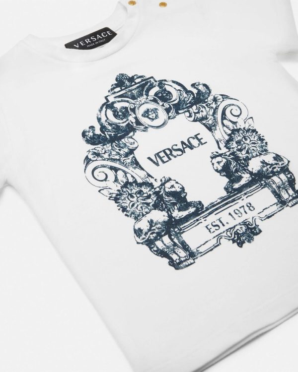 This short-sleeved cotton T-shirt for the little ones features the Versace Logo framed by classical Barocco ornaments. Snap-button closures at the shoulder allow for easy removal.