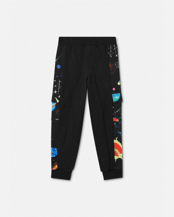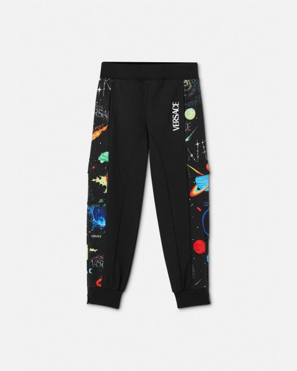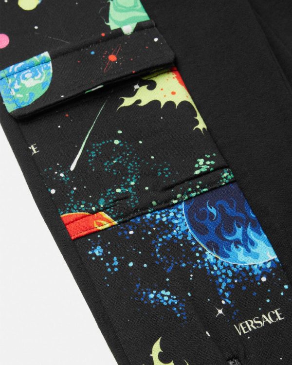 These cotton jersey sweatpants are have a comfy elasticized waistband and zipped cuffs, featuring a galactic print with the Versace Logo throughout.