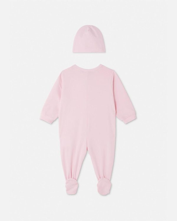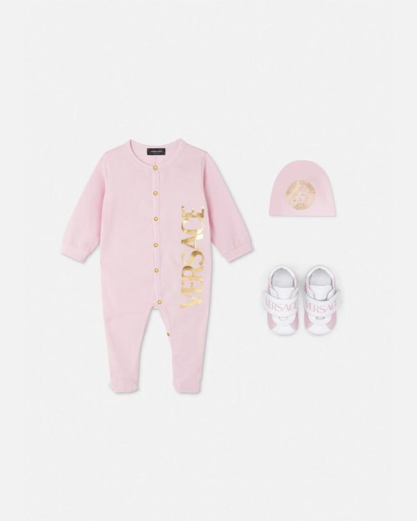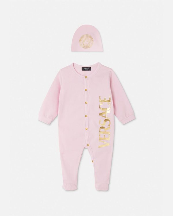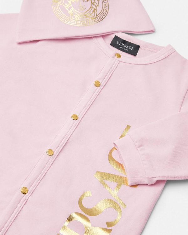 A soft and cozy sleepsuit set for little ones made from cotton jersey with snap-button closures for easy removal. Featuring a Versace Logo at the front, the long-sleeves style with footsies is paired with a matching cap with the Medusa Kids motif.