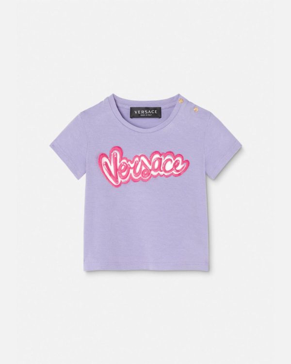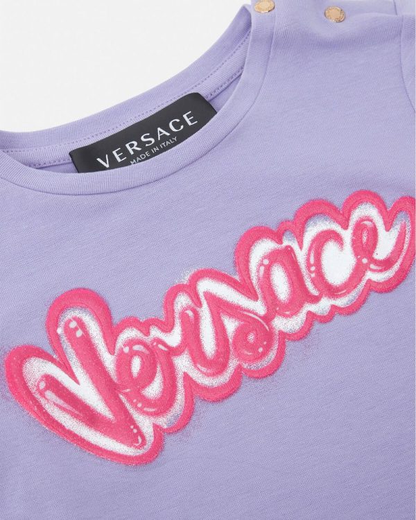 A short-sleeved cotton jersey T-shirt featuring a soft-touch Versace Logo. Snap-button closure at the shoulder allow for easy removal.