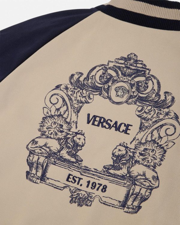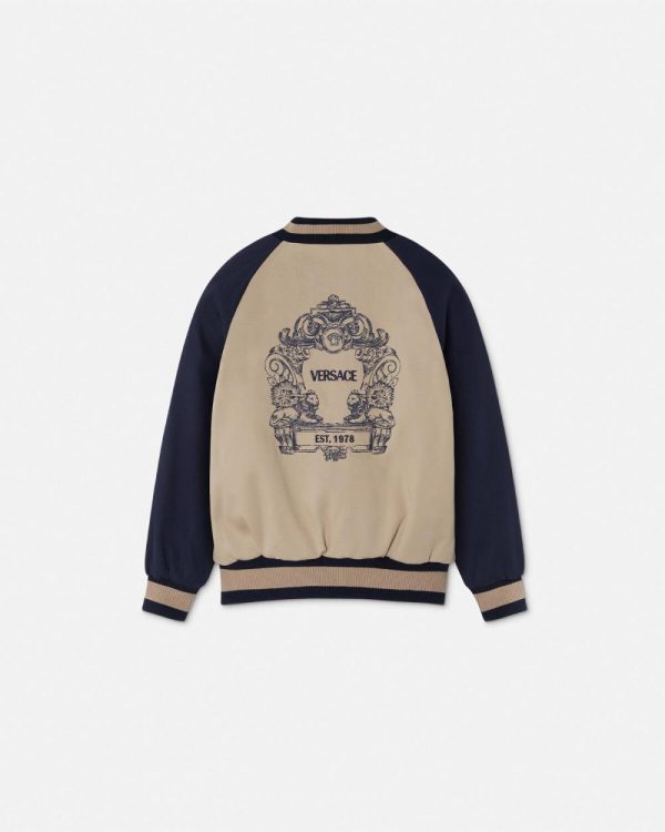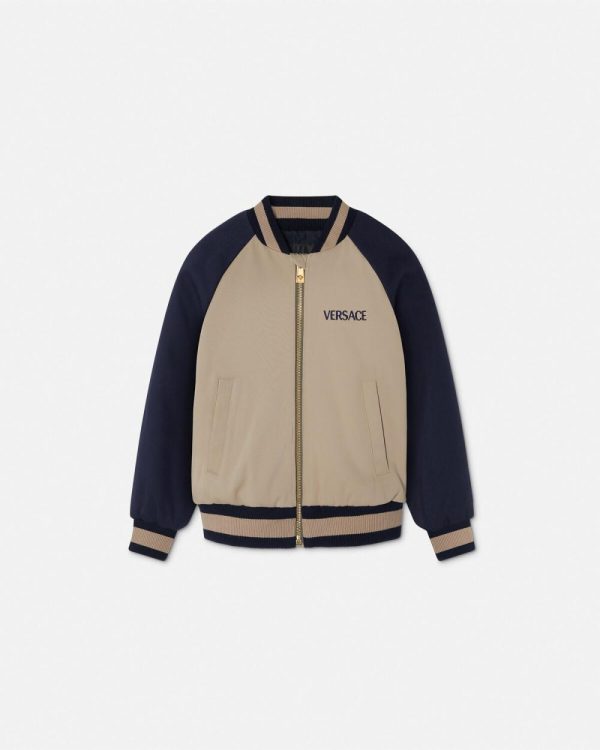 This lightly padded bomber jacket features an embroidered Versace Logo Kids at the chest and an embroidery of Versace Cartouche Logo at the back. The outerwear style is complete with ribbed collar, hem and cuffs.