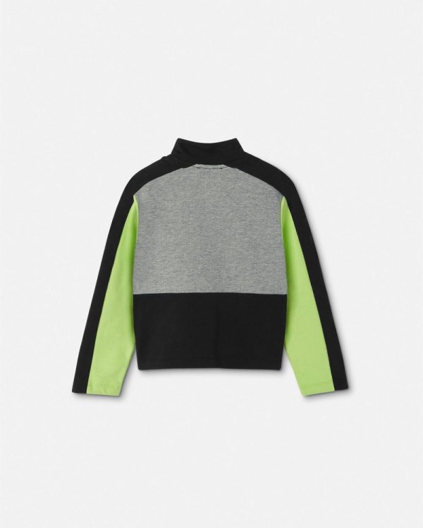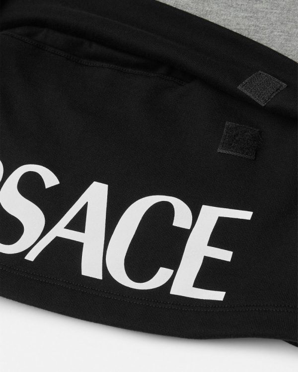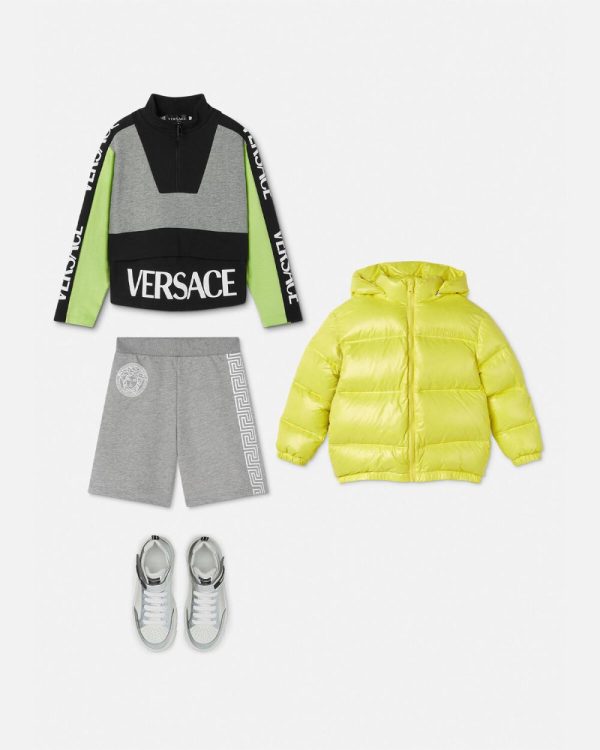 A jersey high-neck sweatshirt ideal for active play dates and sport activities, featuring a half-zipped closure, a concealed front patch pocket and contrasting Versace Logo along the sleeves.