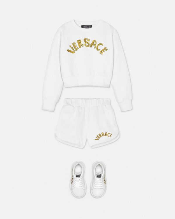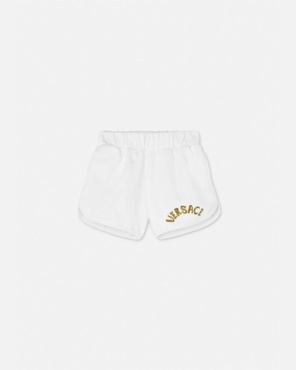 These cotton jersey sweat shorts are ideal for active play dates, featuring a comfy elasticized waistband and embroidered Seashell Baroque Versace Logo.