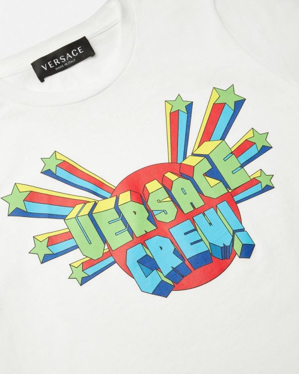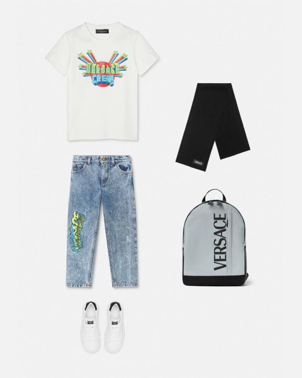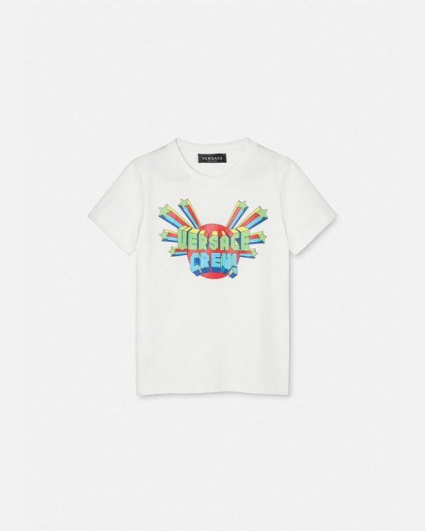A short-sleeved T-shirt crafted from cotton jersey featuring a fun and playful Versace Logo Kids print at the front.