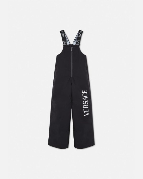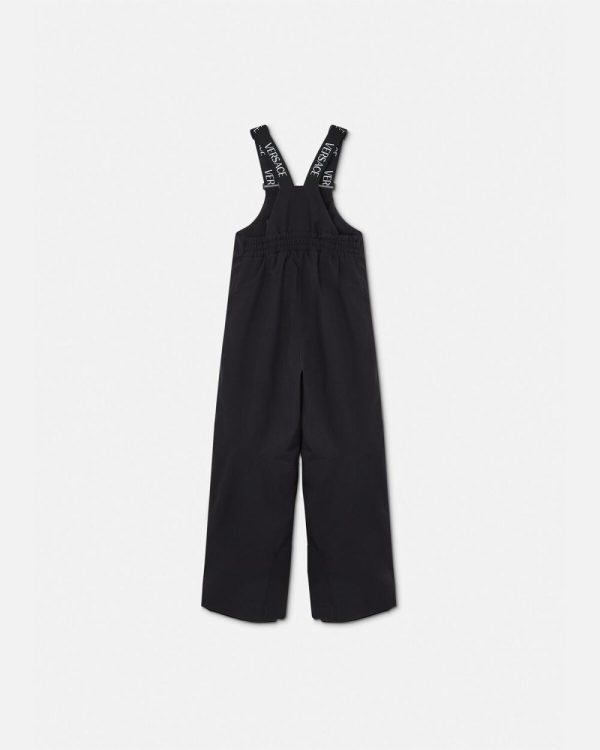These padded snow pants for little ones feature the Versace Logo at the leg and on the shoulder straps. A cold weather style, it has a front zip closure and a side zip pocket.