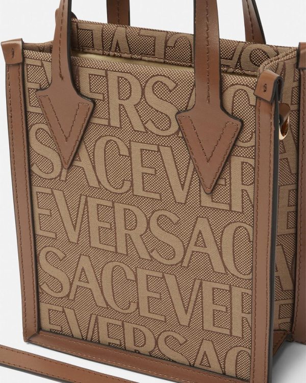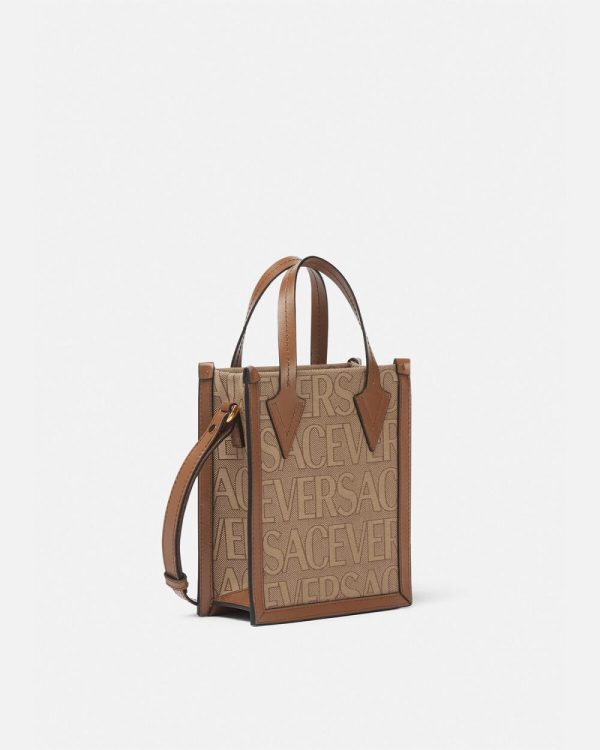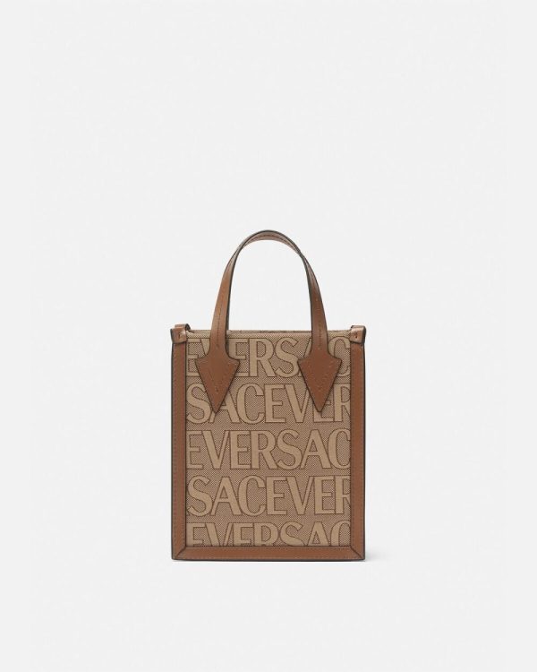 A small crossbody tote bag made from jacquard canvas in the Versace Allover pattern with leather trims. The open-top style is finished with leather handles and an adjustable and removable shoulder strap.