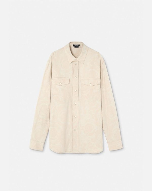 This lightweight denim chambray shirt features a Barocco silhouette jacquard pattern and Medusa mother-of-pearl snap buttons.