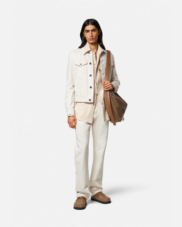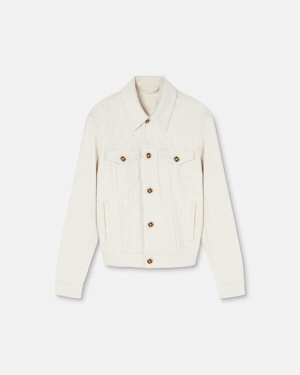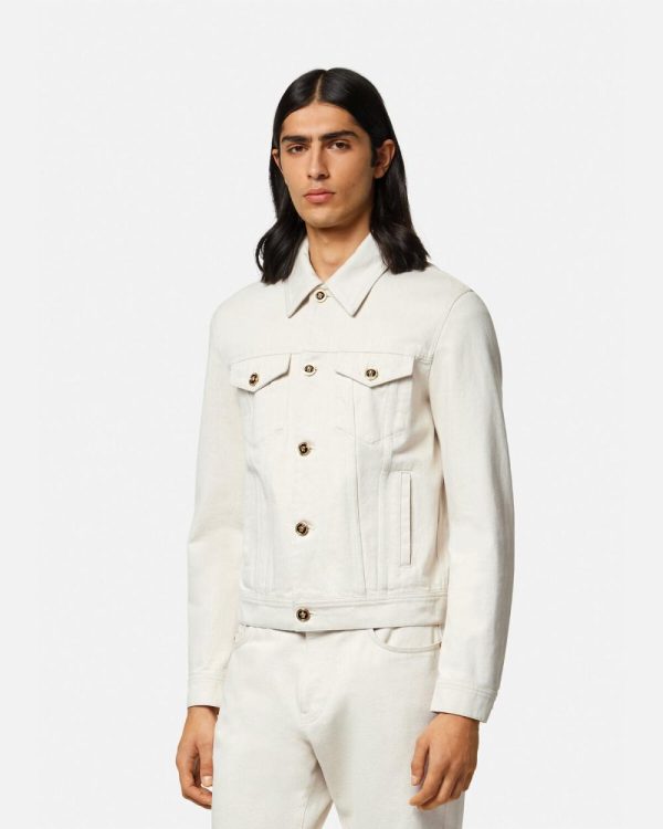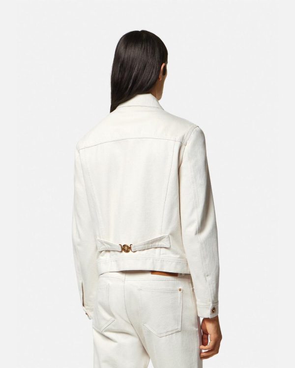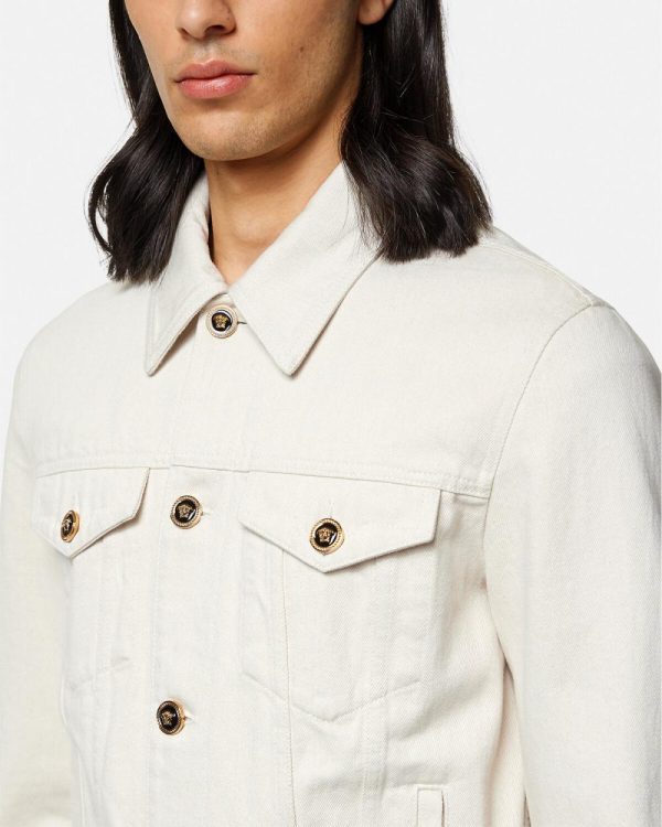 This long-sleeved button-down denim jacket is accented by enamel Medusa hardware. The back features a Medusa Biggie strap with a clic-clac closure for an adjusted fit.