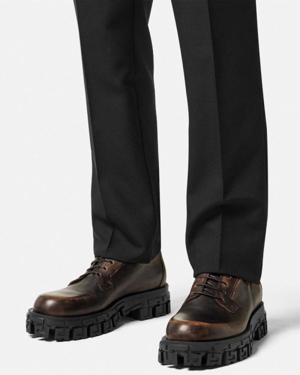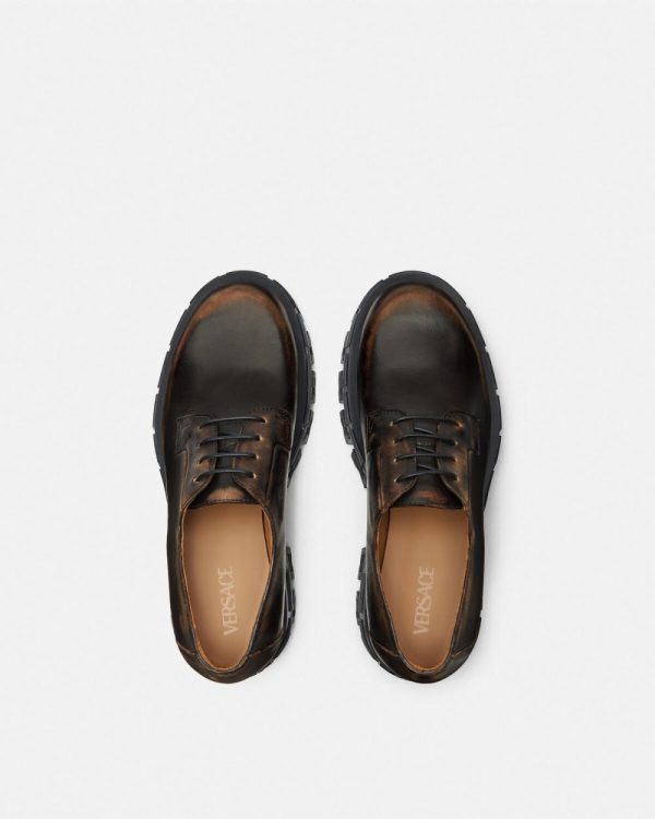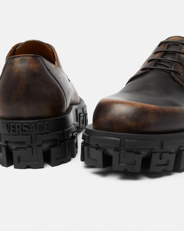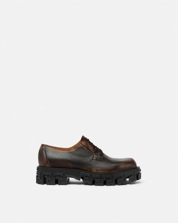 These Derby shoes feature a burnished leather finish at the uppers and are set on Greca-embossed rubber soles.