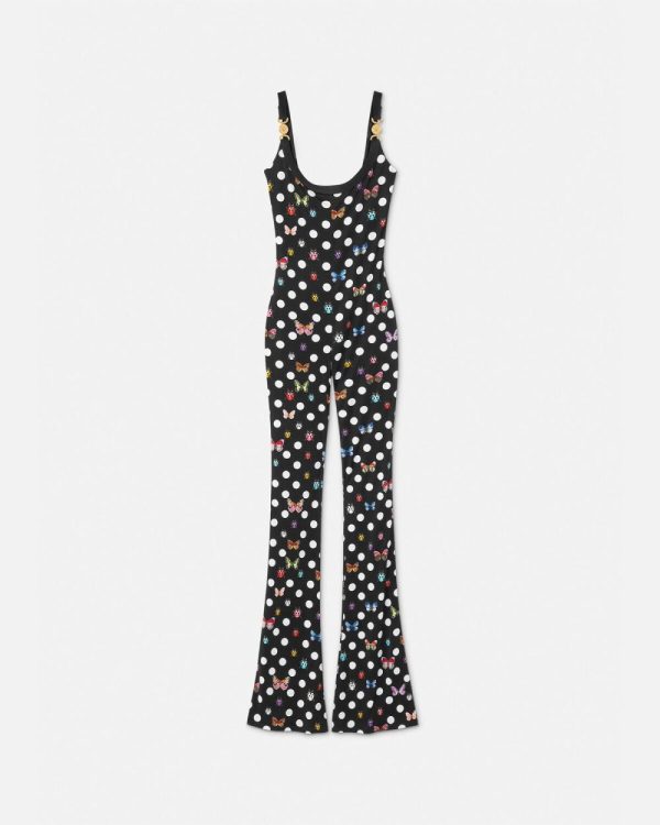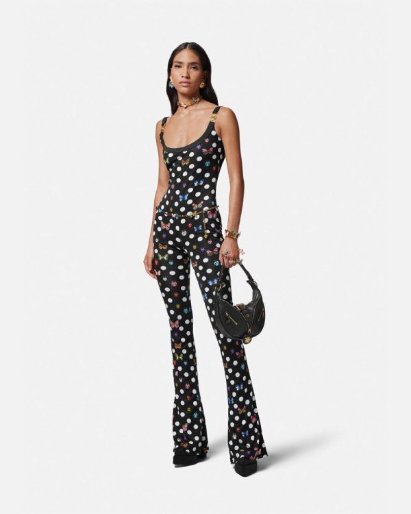 Versace presents Dua Lipa x Versace – a capsule collection co-designed with Dua Lipa. This fluid jersey sleeveless jumpsuit features a polka dot print with butterflies and ladybugs motifs, detailed with ‘nastro Gianni’ satin trims and accent Medusa ’95 hardware at the shoulder straps.