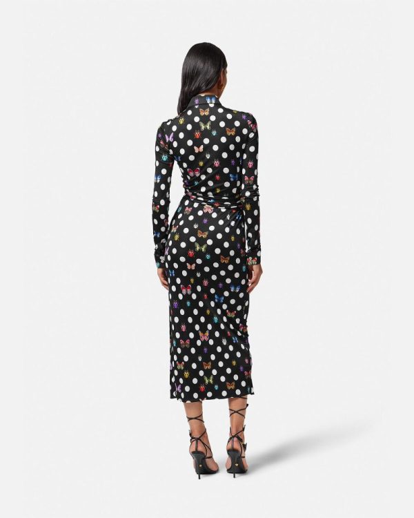 This fluid jersey shirt midi dress features an wrap Medusa ’95 clic-clac belt and has an all-over butterflies and ladybugs print with a polka dot background. This item is part of the capsule collection co-designed with Dua Lipa.