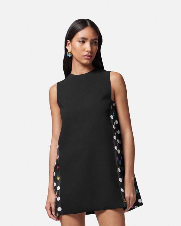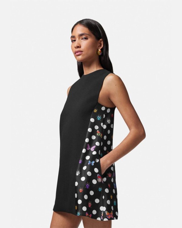 Versace presents Dua Lipa x Versace – a capsule collection co-designed with Dua Lipa. This shift mini dress has a sleeveless silhouette, made from crepe satin panels with silk twill inserts at the side with polka dot butterflies and ladybugs.