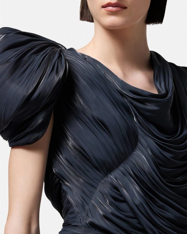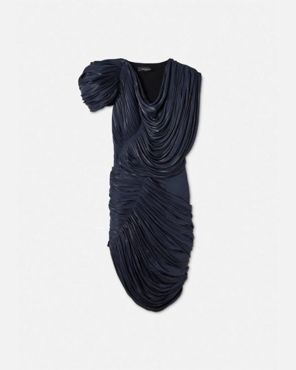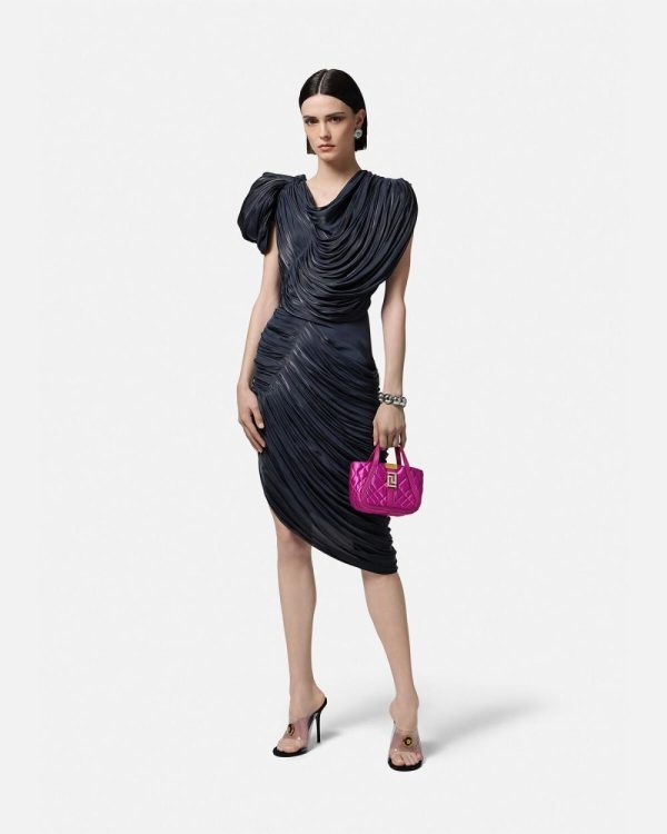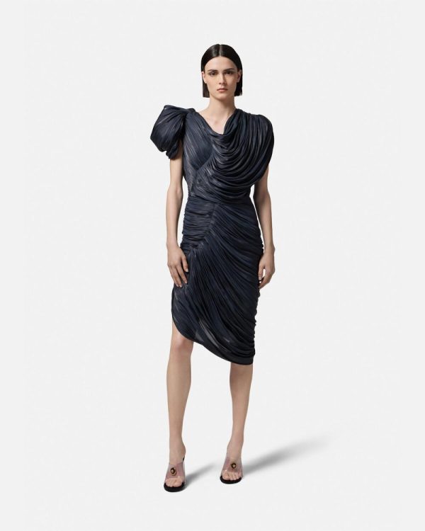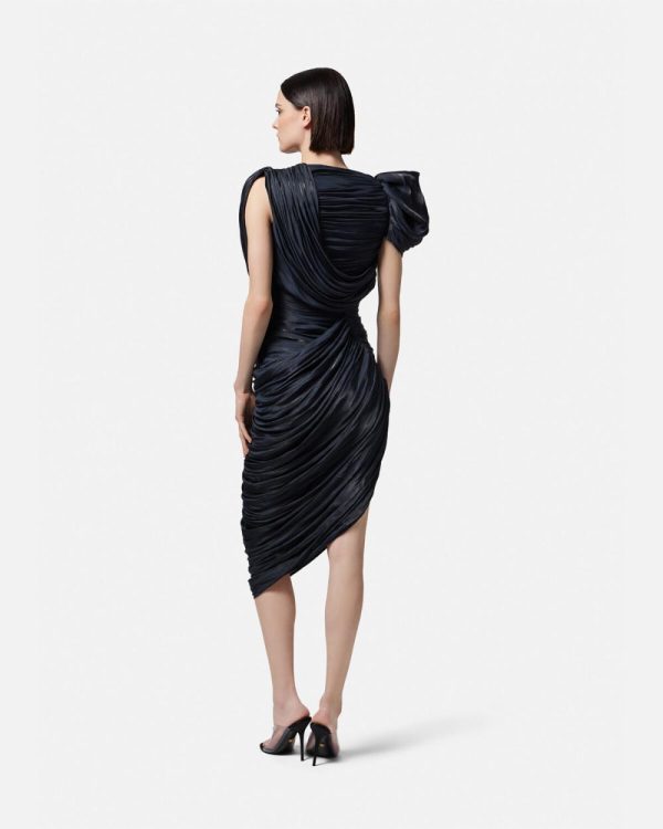 This midi dress is made from technical twill with fluid draped pleating. The asymmetric design has a structured shoulder volume, reinforced by an interior mesh panel.