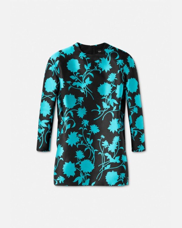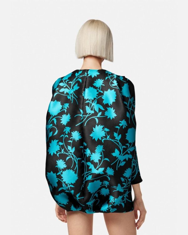 This duchesse mini dress has a back cocoon-shaped silhouette with rounded shoulders and a Floral Silhouette print.