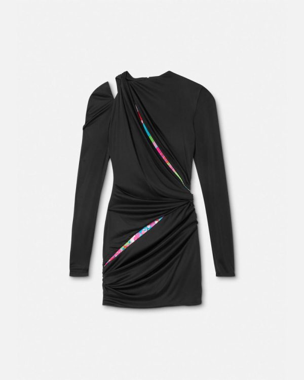 Dua Lipa is guest designer of the Dua Lipa x Versace capsule collection, made in collaboration with Donatella Versace. This asymmetric long-sleeved dress has a cutout sleeve, draped knot details, and slashed Floral Summer print inserts.