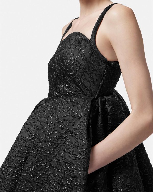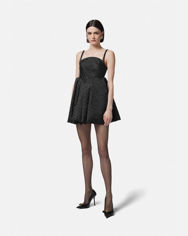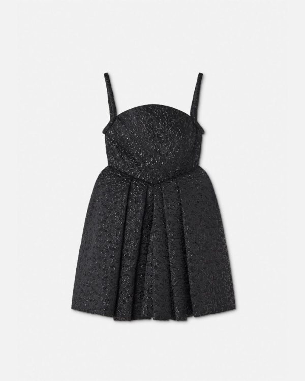 This sleeveless mini dress is crafted from lurex Cloquet in a jacquard couture-like technique. Lined corset boning defines the curved structural bust, while the waist is accentuated by a box-pleated skirt.