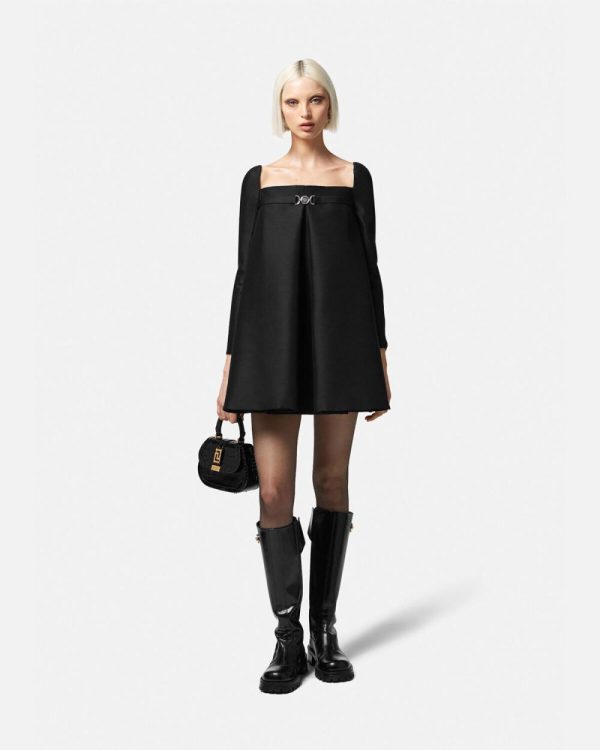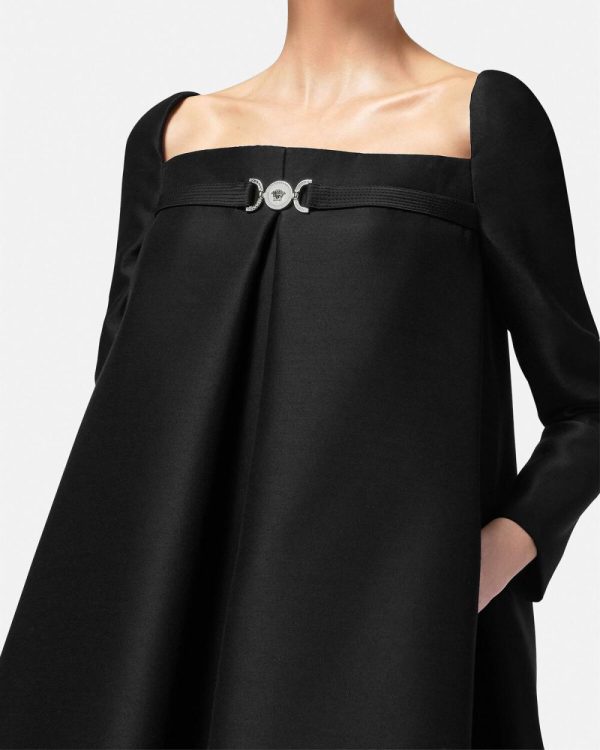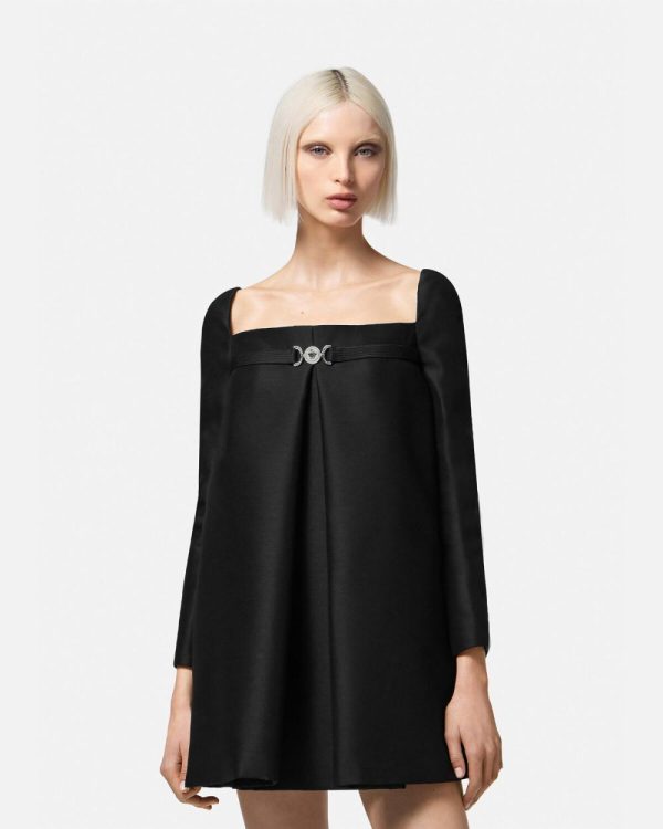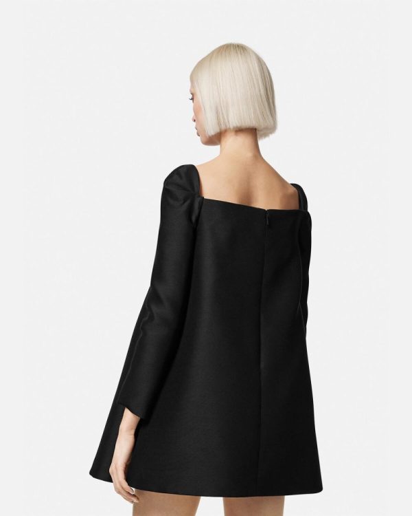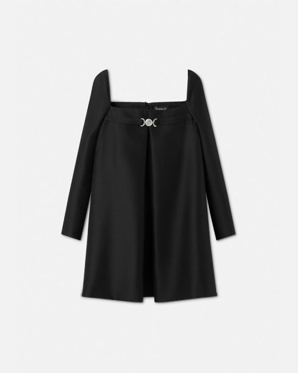 This wool and silk blend A-line long-sleeved mini dress has box-pleat inserts at the front and back for volume with a forward-kick movement. A ‘nastro Gianni’ band with a Medusa ’95 detail accents the straight neckline and is reinforced by an interior corset structure.