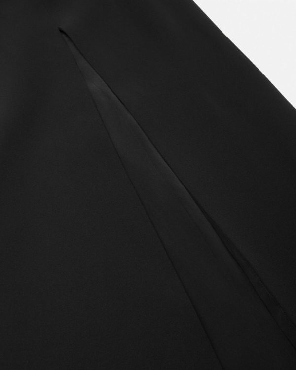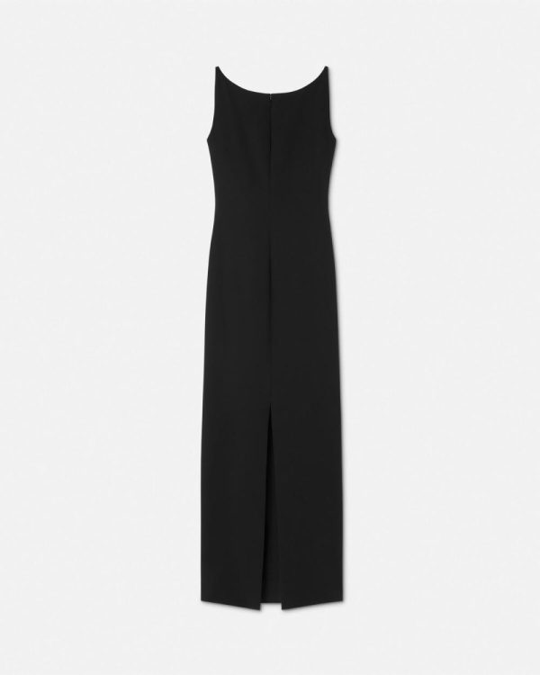 This long evening dress features a signature Versace fluted neckline, accented by Medusa ’95 hardware at the shoulder straps.