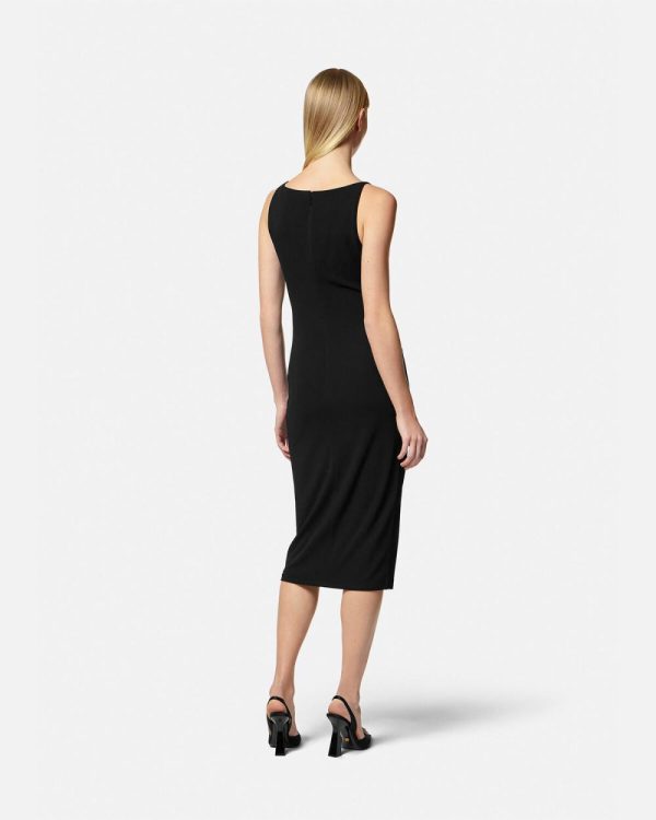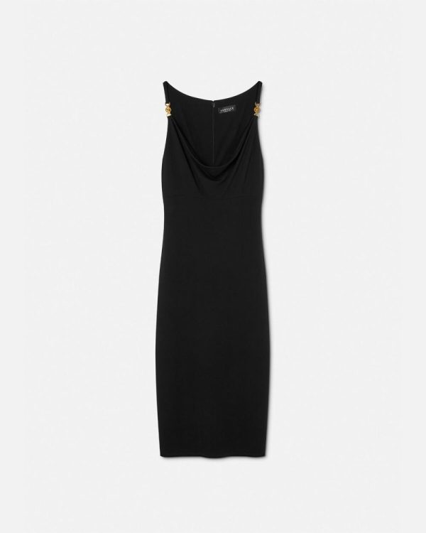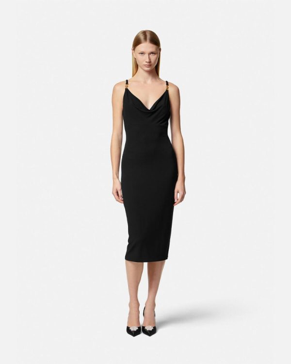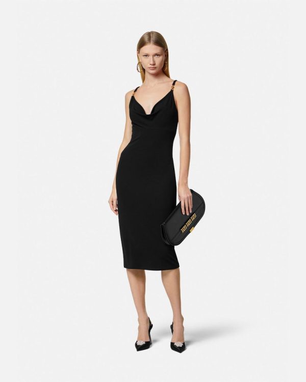 This midi dress is made from fluid jersey in a slim-fitting silhouette with a draped cowl neckline. The shoulder straps are accented by Medusa ’95 emblem.