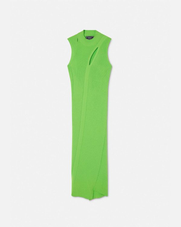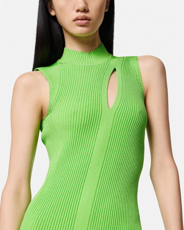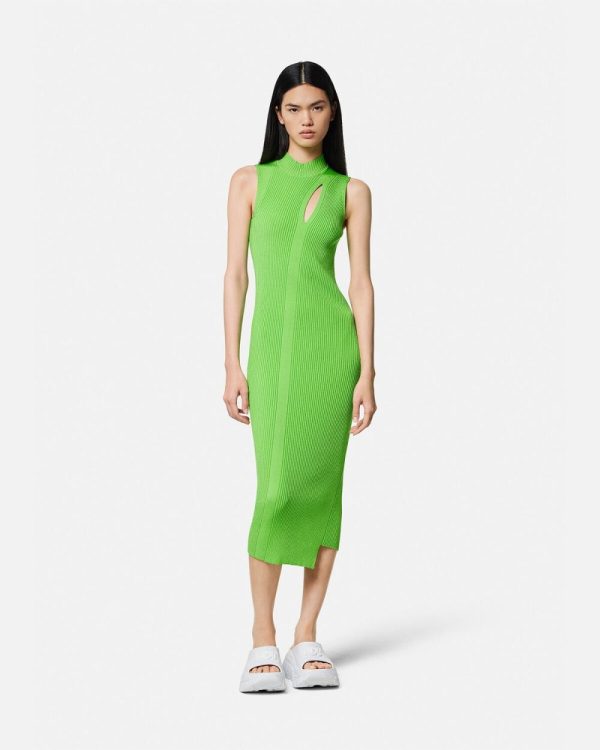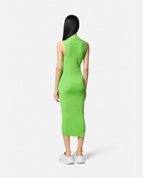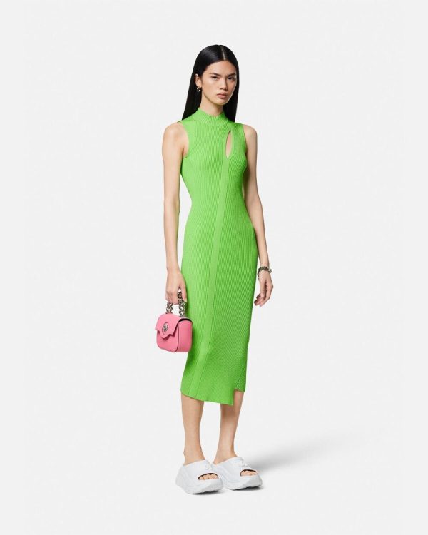 A sleeveless and asymmetric ribbed turtleneck midi dress featuring a front slash cutout, diagonal twisted seams and a small Medusa stud at the back.
