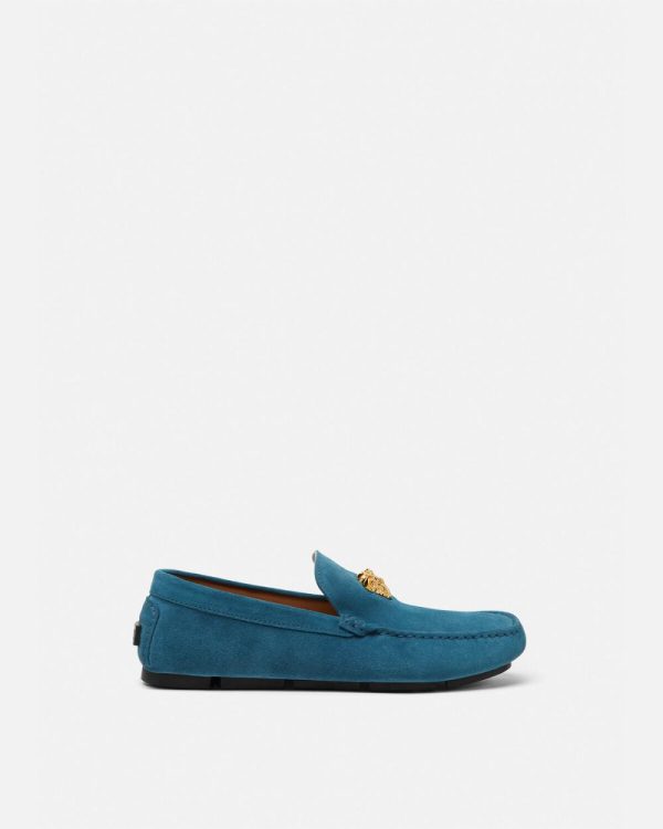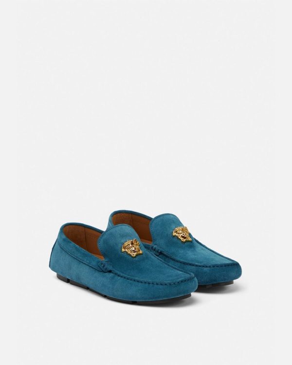 A slip-on design, these suede driving shoes are accented by the La Medusa emblem on the uppers, and are set on rubber soles.