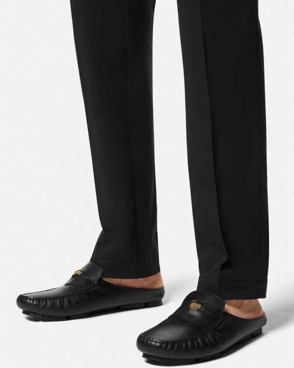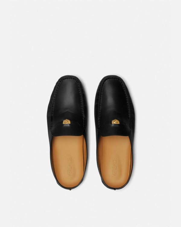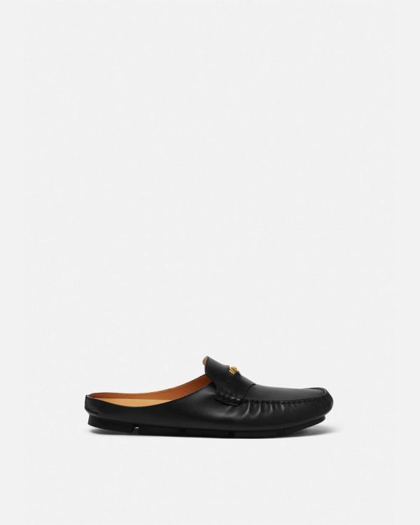 Leather driving shoes with an open back featuring a Medusa Biggie hardware at the penny strap.