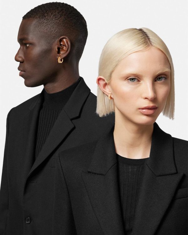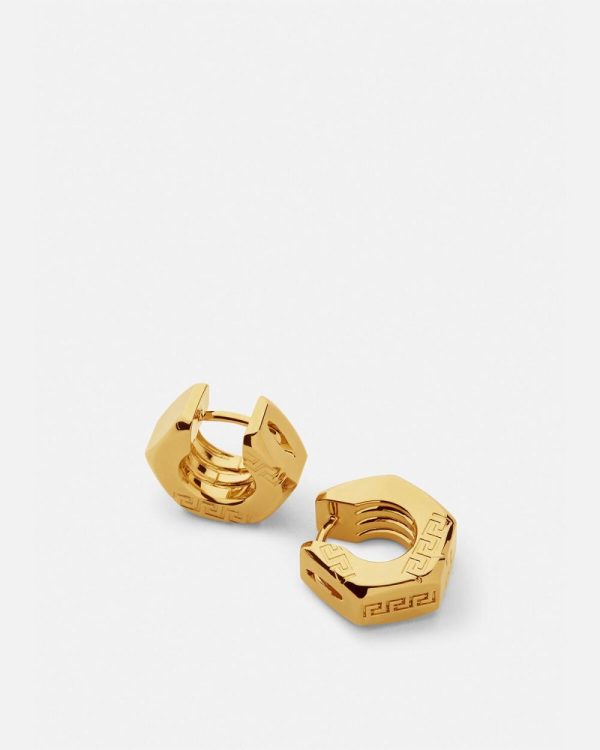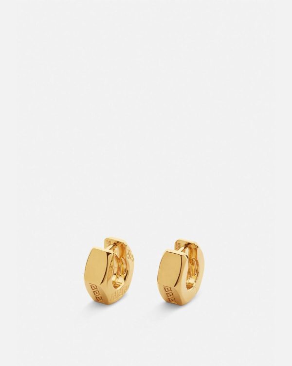 A pair of Greca engraved earrings part of the Nuts & Bolt line. All Versace jewelry products are lead and nickel free. All materials are hypoallergenic.
