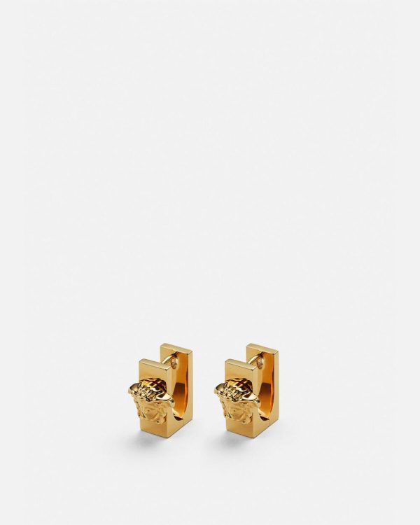 A rectangular pair of Medusa earrings featuring a hinge closure. All Versace jewelry products are lead and nickel free. All materials are hypoallergenic.