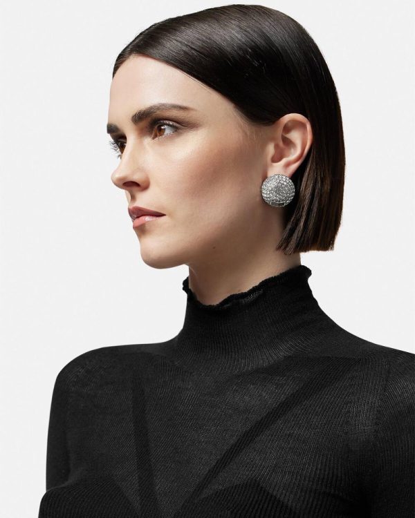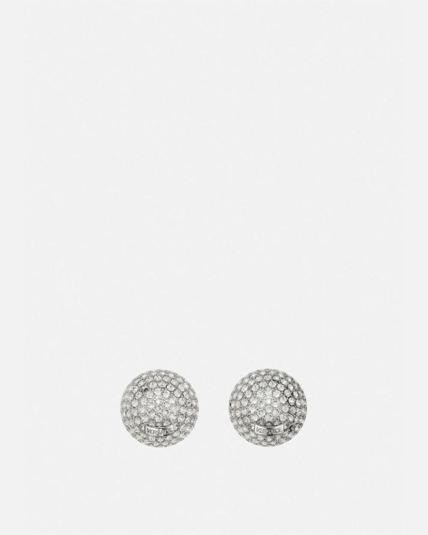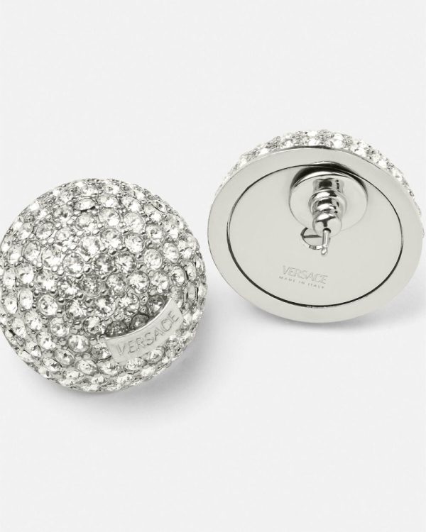 These earrings feature crystal covered spheres with a logo engraved plaque. All Versace jewellery products are lead and nickel free. All materials are hypoallergenic.