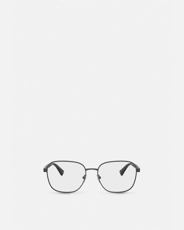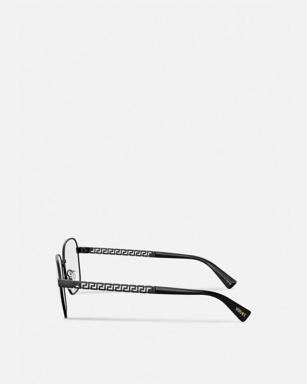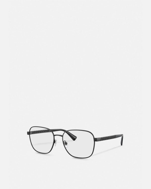 These optical glasses feature a squared shape and thin metal frames and are accented by a delicate Greca openwork at the temples