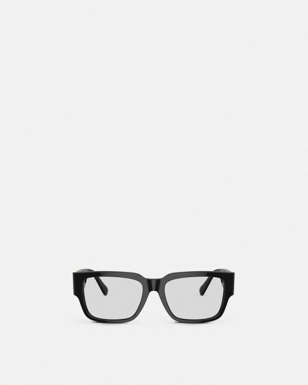 Square-frame optical glasses defined by geometric lines, accented by a Medusa hardware at the side.