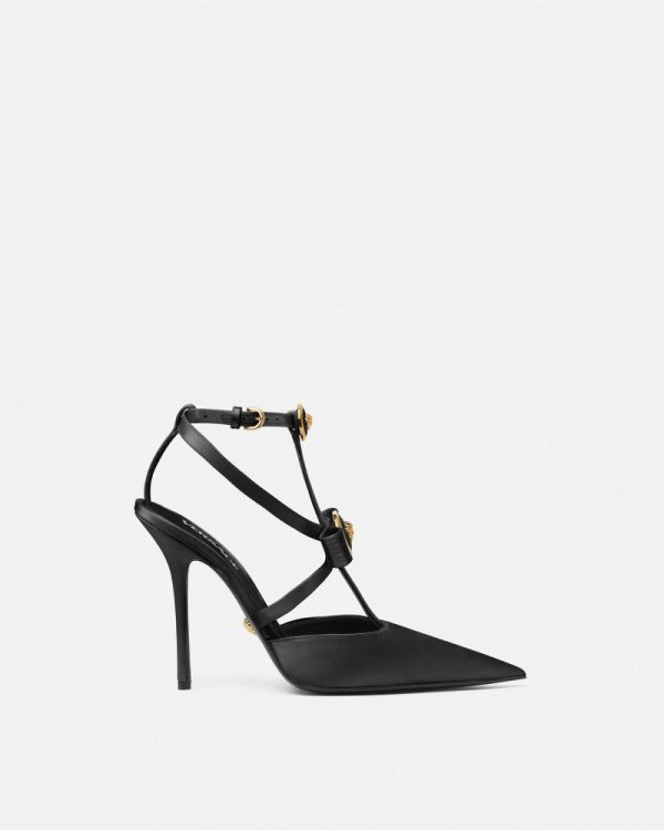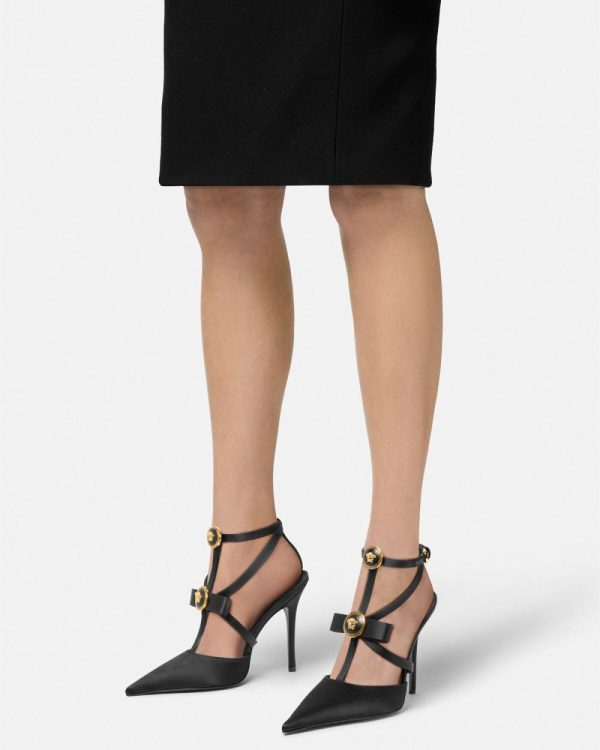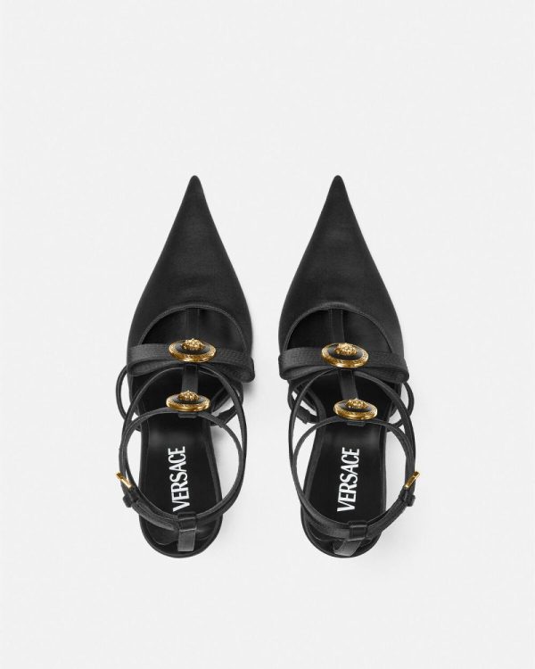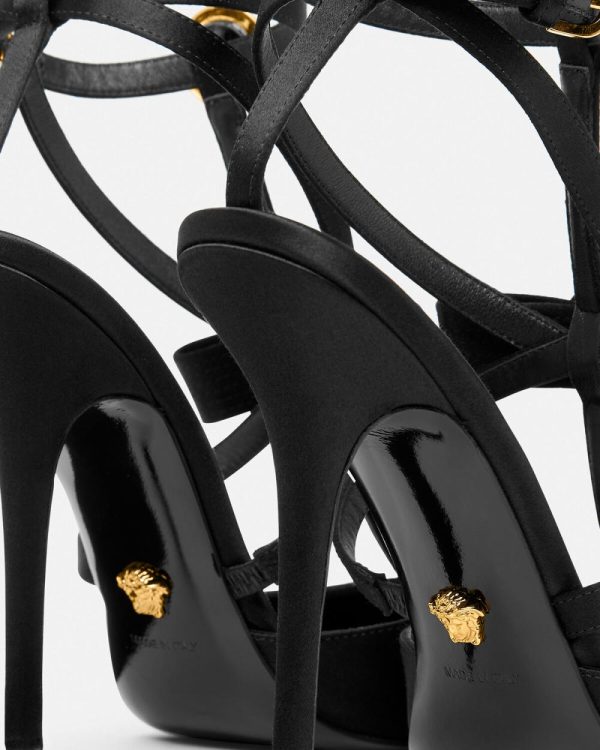 High-heeled slingback satin pumps crafted with cage-inspired ‘nastro Gianni’ bows and Medusa hardware at the front.