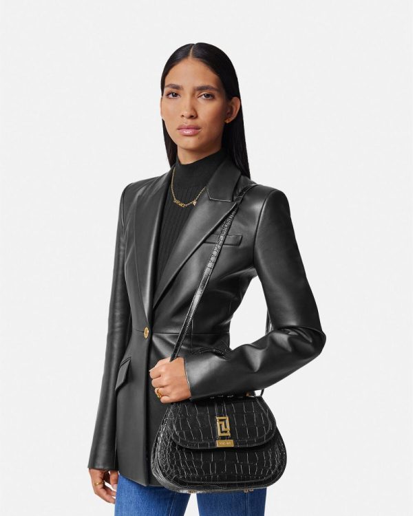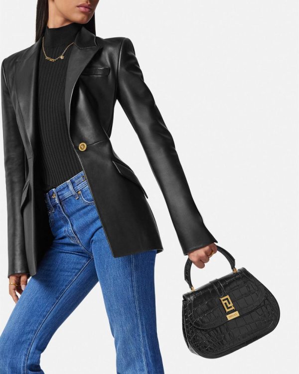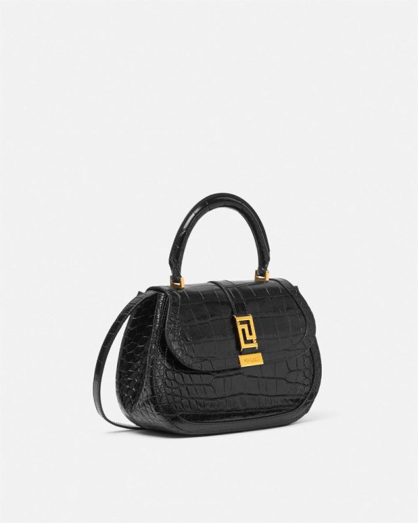 This handbag is crafted from croc-effect embossed leather and is part of the Greca Goddess line, characterized by the central Greca chain hardware. This design feature a rigid top handle and a detachable shoulder strap.