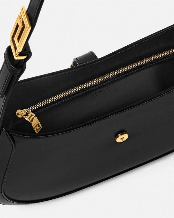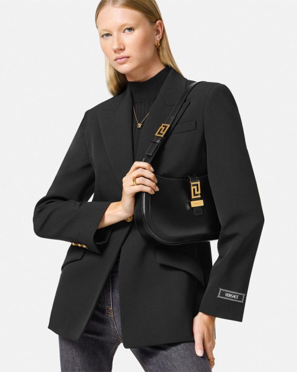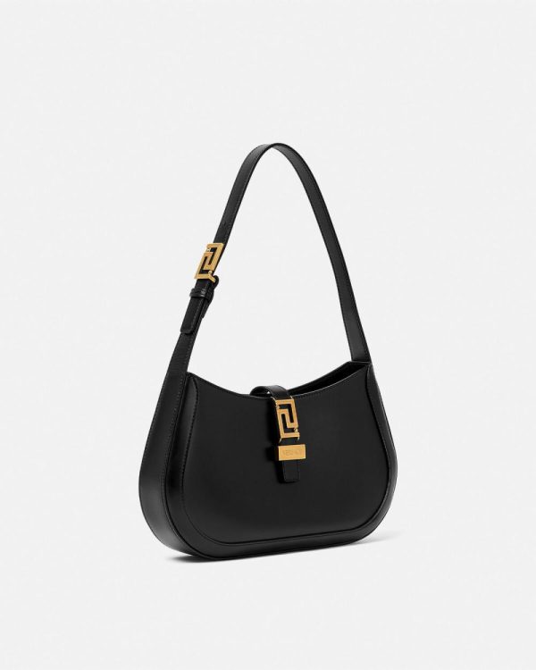 This polished leather hobo bag is part of the Greca Goddess line, characterized by the signature Greca chain hardware at the closure and shoulder strap.