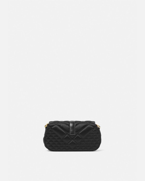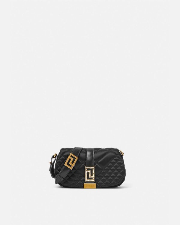 The Greca Goddess line is characterized by the central Greca chain hardware. Crafted in Italy from quilted satin, it features a spacious interior with an additional slip compartment. A leather strap can be adjusted for shoulder or hand-carry options.