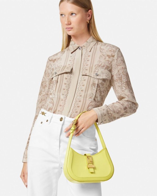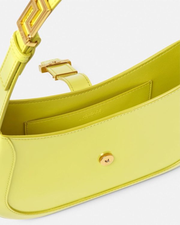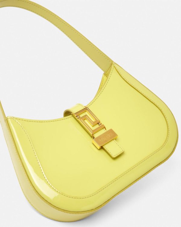 A hobo silhouette from the Greca Goddess line crafted from patent leather, characterized by the signature Greca chain hardware at the closure and shoulder strap.