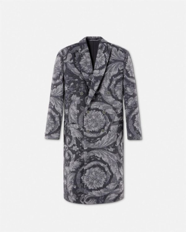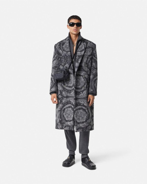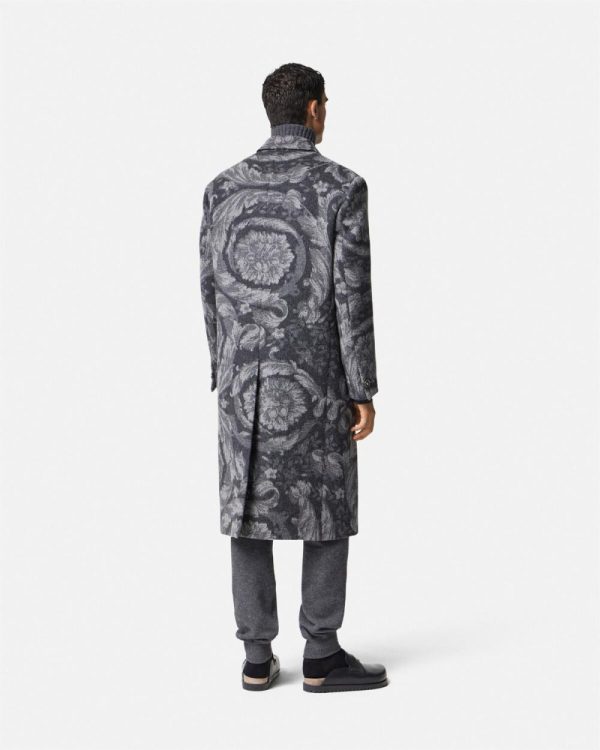 A double-faced wool and cashmere blend coat featuring an all-over Barocco pattern. The fully lined double-breasted style is accented by enamel Medusa hardware and has a peaked lapel.