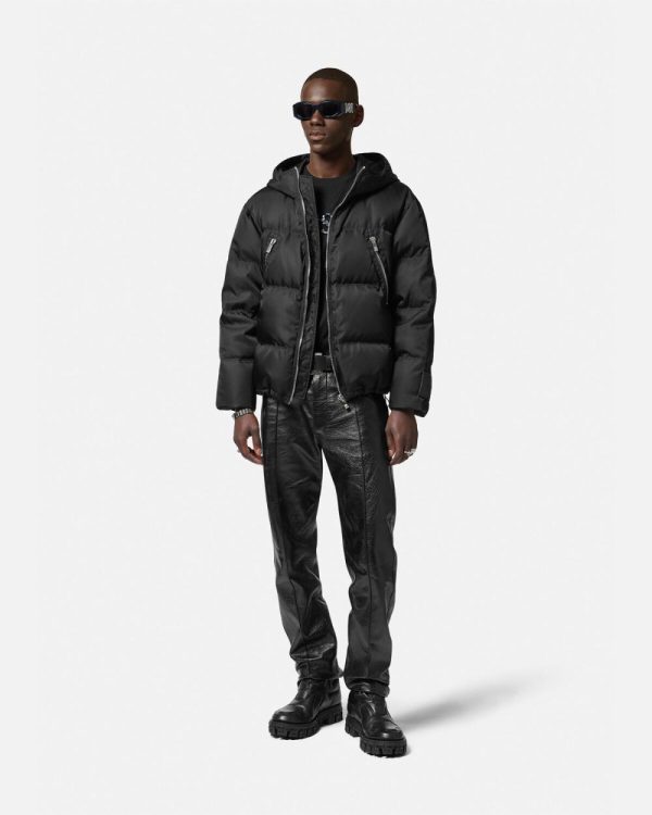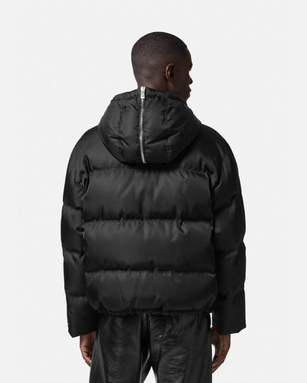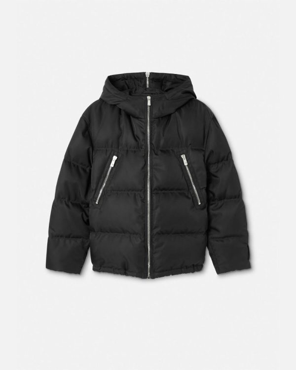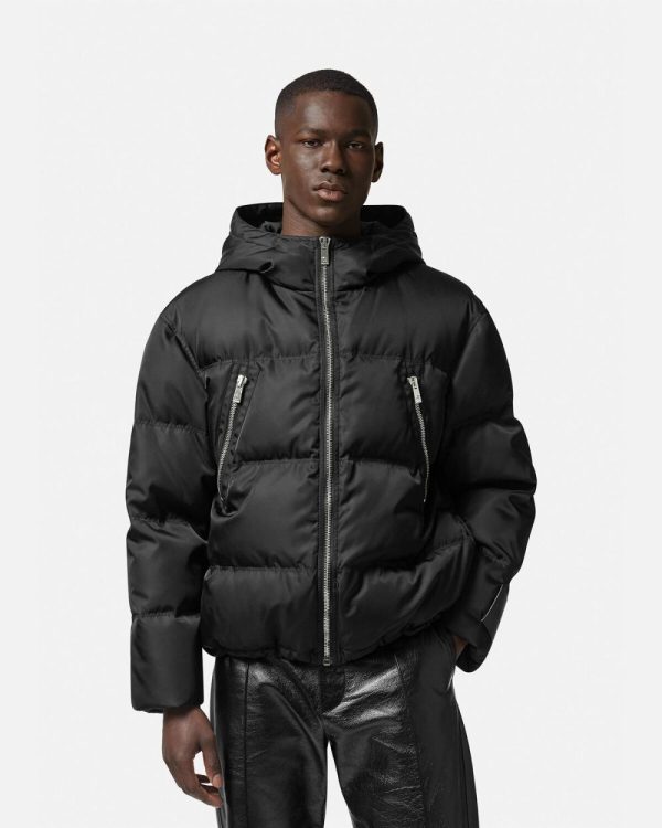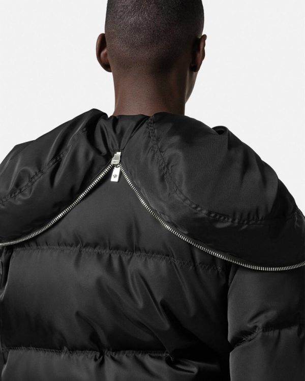 This technical nylon padded puffer jacket has a zipped drawstring hood in reference to the Repeat bag that opens as a cape over the shoulders.