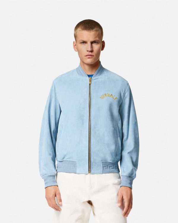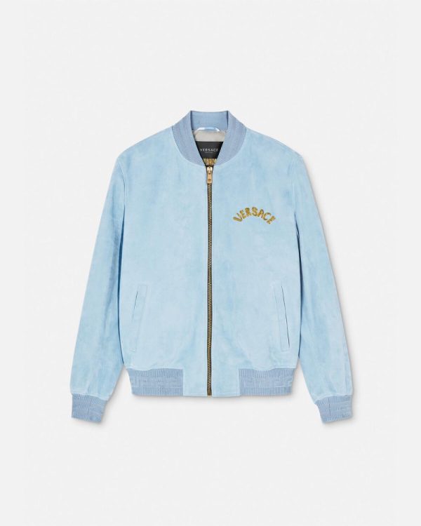 A suede bomber jacket featuring Greca-knit ribbed trims and an embroidered logo at the chest. The outerwear style is fully lined in the Seashell Baroque Polka Dot print.