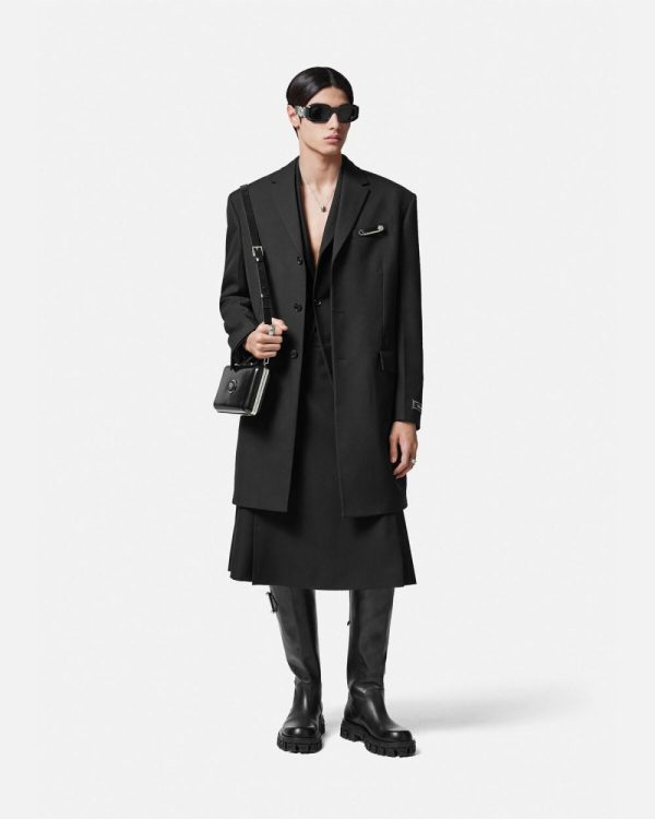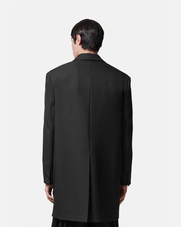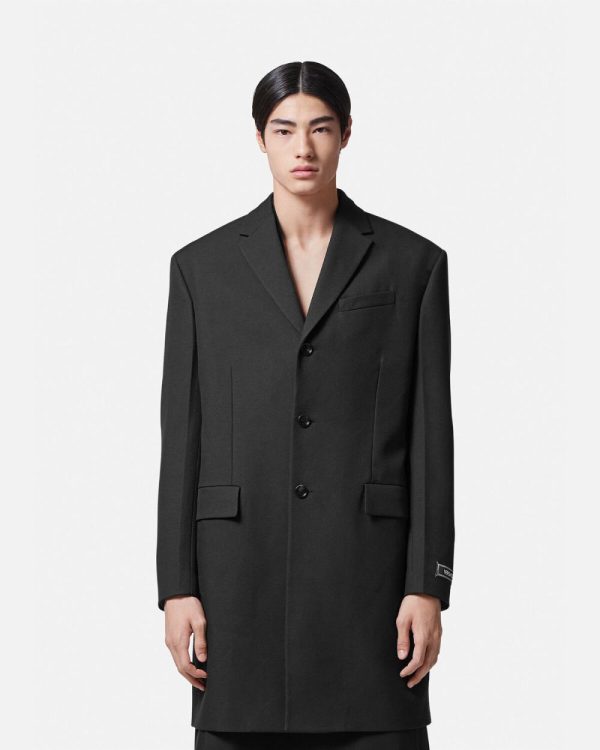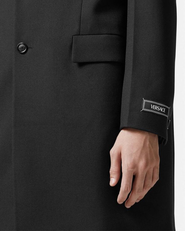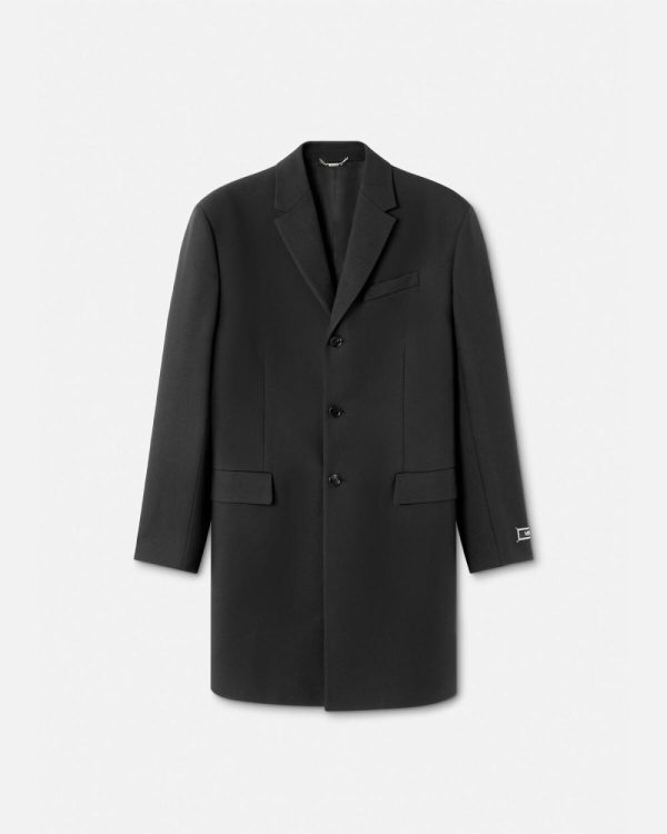 This mid-length single-breasted coat is fully lined and made from cavalry virgin wool with notched lapels and a tailoring logo label at the sleeves.