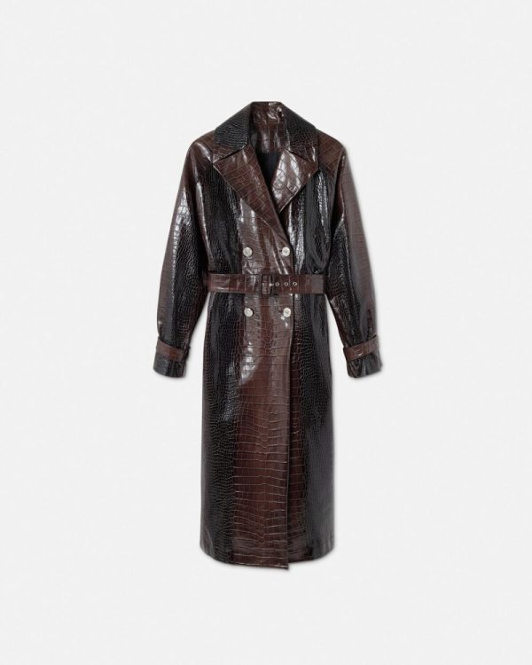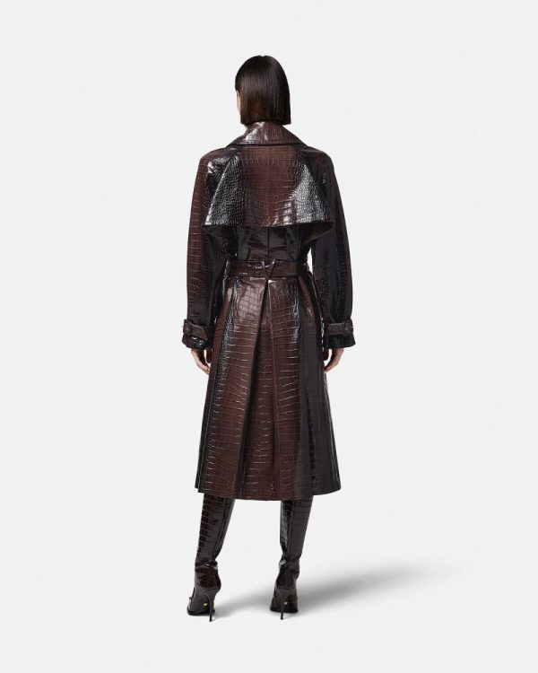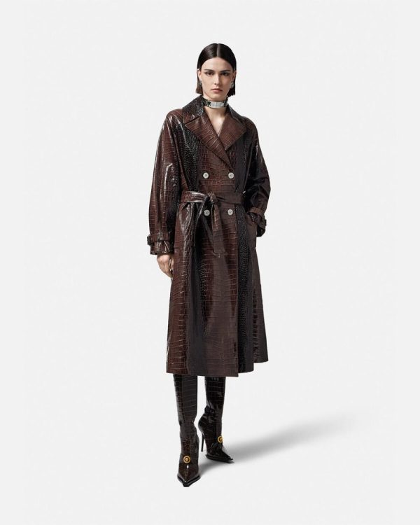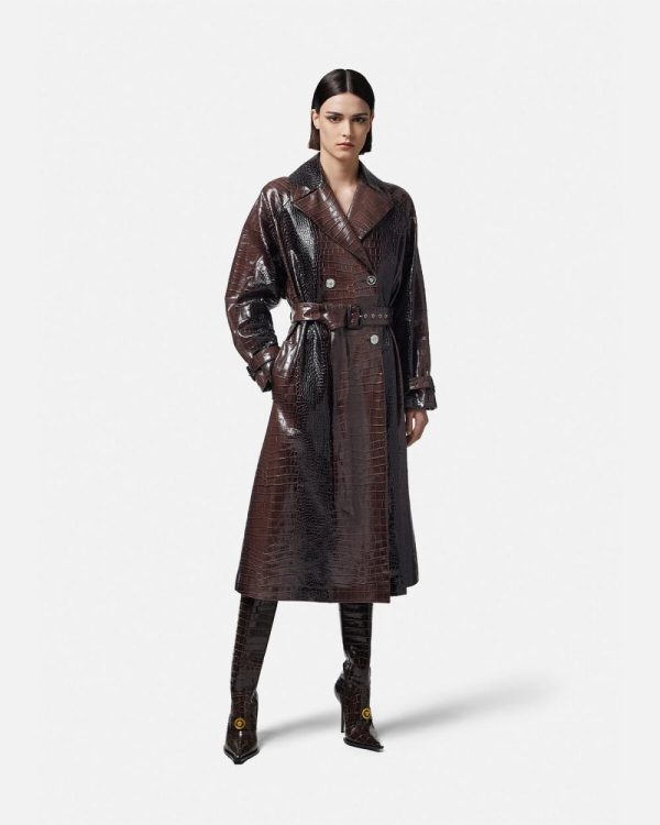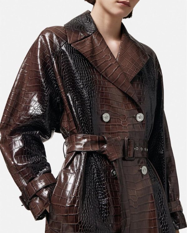 This long belted trench coat is made from crocodile-effect embossed leather. The double-breasted design is accented by Medusa hardware and V-shaped belt loops at the back. It’s finished with a jacquard Barocco Silhouette lining and back box pleats.