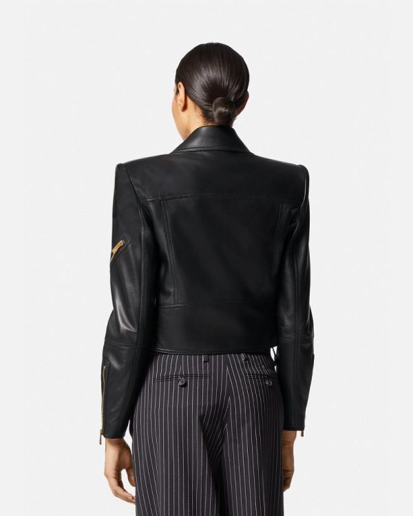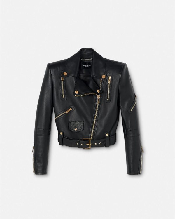 Made entirely from leather in a smooth grain finish, this cropped biker-inspired jacket has a diagonal zipper, belted waist and is accented by Medusa hardware and decorative zipped pockets.