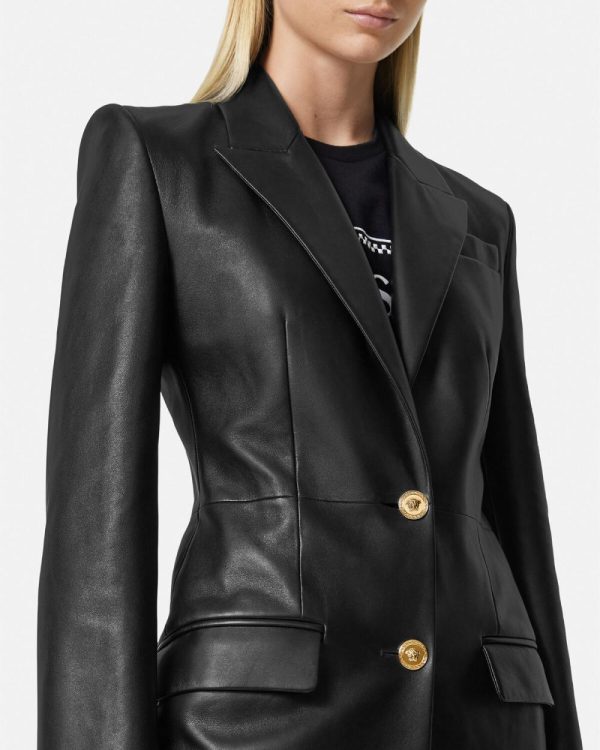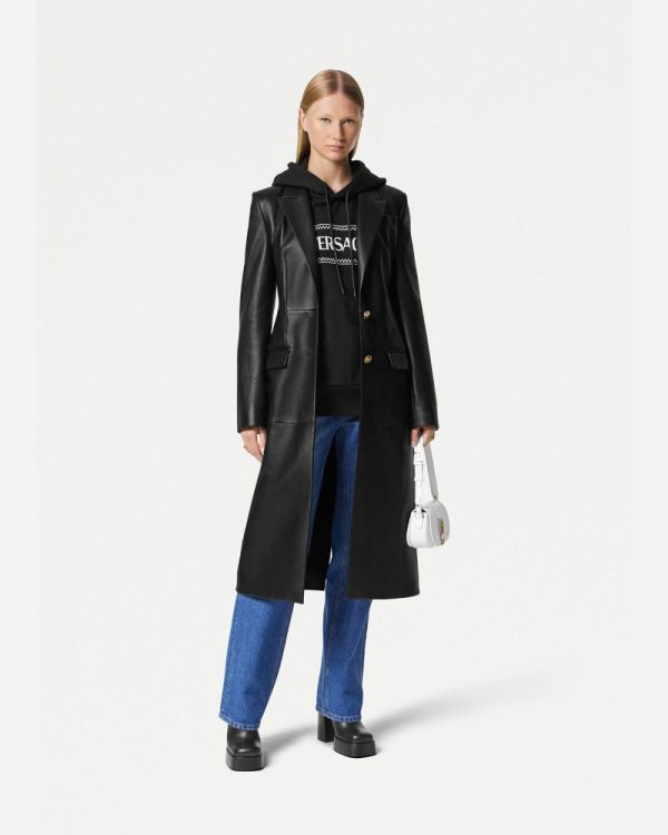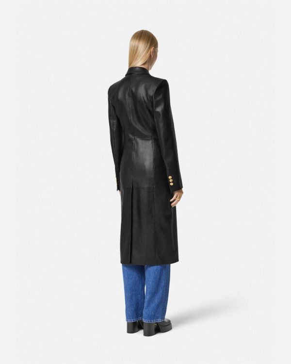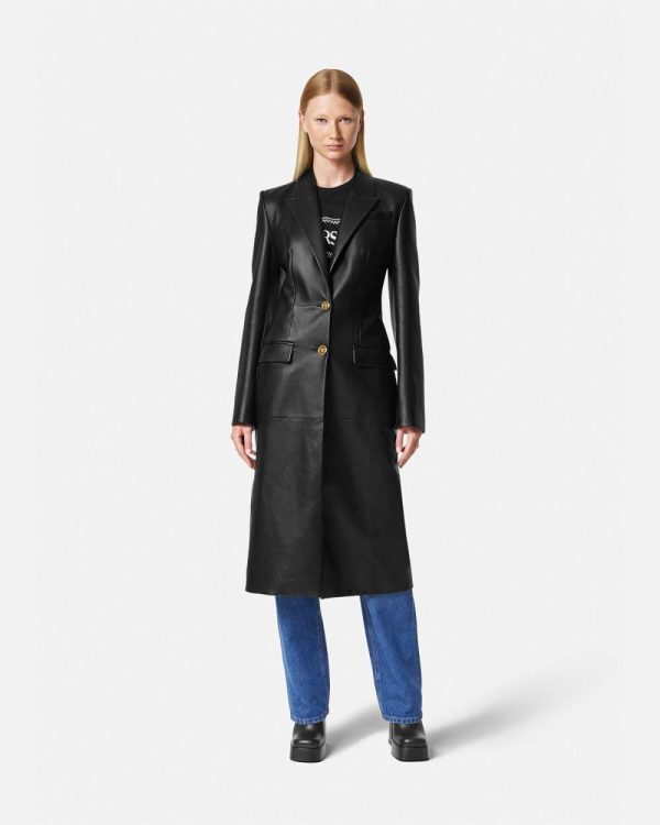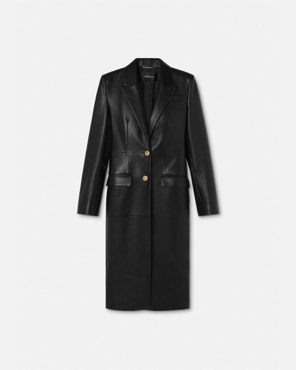A long single-breasted coat accented by Medusa hardware, featuring peaked lapels and a structured silhouette.