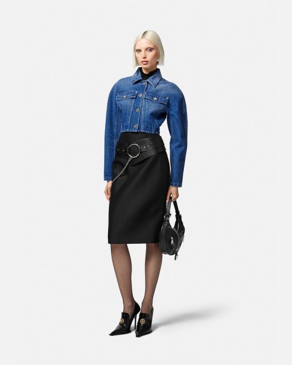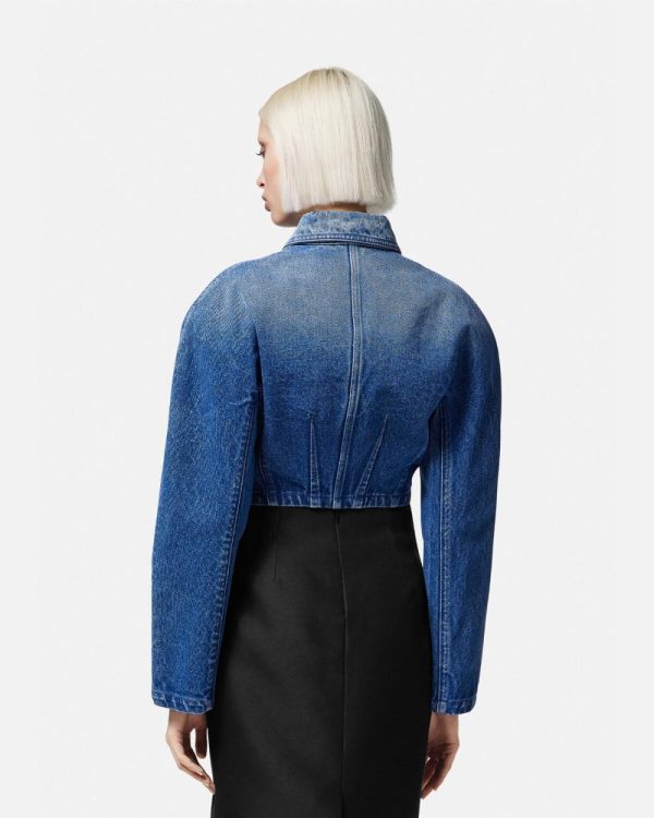 This cropped denim jacket features padded, rounded couture shoulders with signature Medusa buttons.
