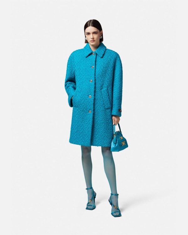 This bouclé wool coat is accented by Medusa hardware and features rounded couture shoulders with a jacquard Barocco Silhouette lining.
